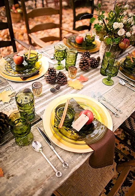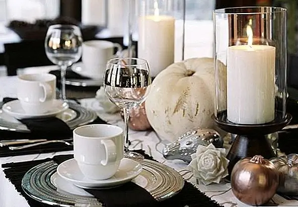 Установите свои столы с более теплыми цветами. В осенних тонах добавьте свечи и свежие фрукты, тыквы или тыквы. Выше хозяйки спрей нарисовал ее тыквы и тыквы серебряными и золотыми тонами для более формального вида.