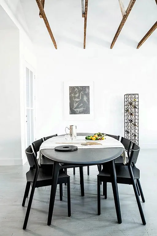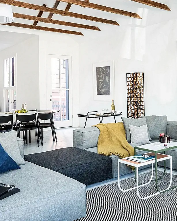 «В качестве приоритета была выбрана универсальность мебели, мы выбрали модульную секционную, старинную барную корзину и укладку столовых стульев для поддержки различных общественных мероприятий», - сказали дизайнеры в Geremia. «Сочетание старинных и современных деталей усиливает контраст, присущий оригинальной деревянной структуре здания и современным побелкам».
