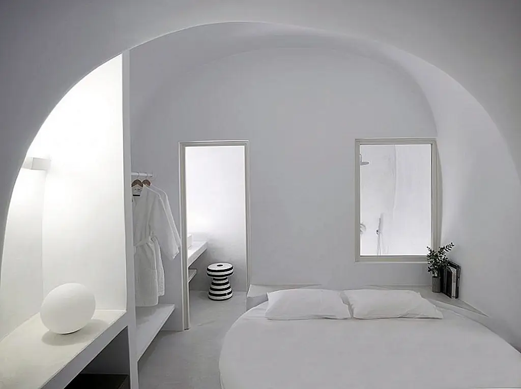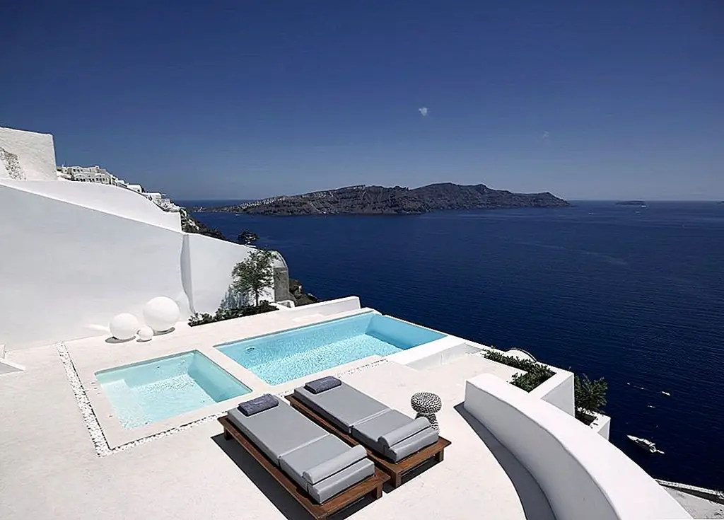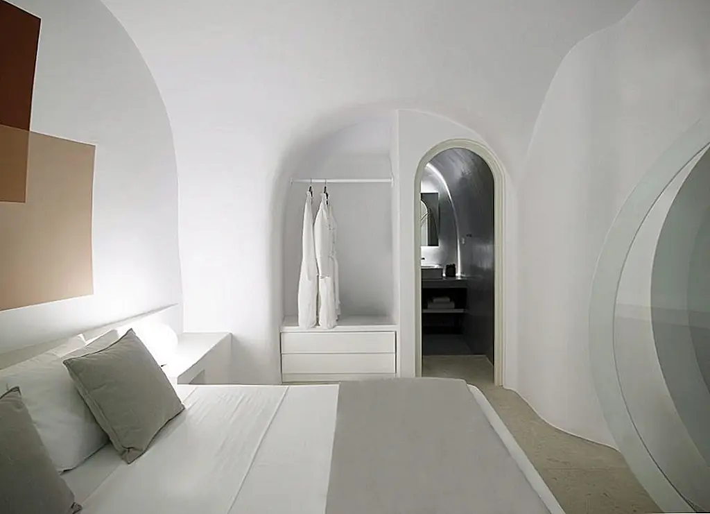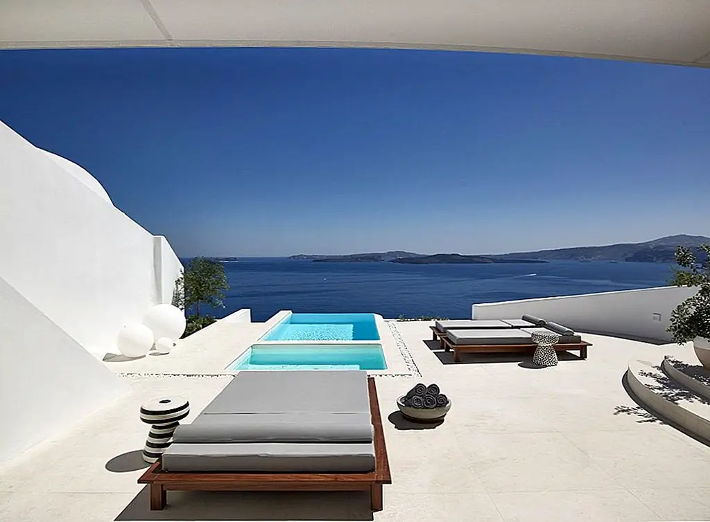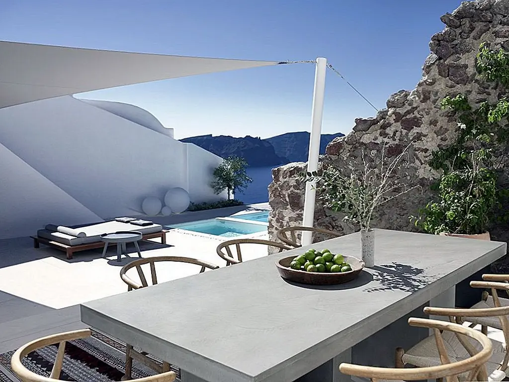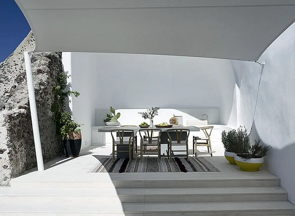 Этот проект делает большую часть своего местоположения скалы, охватывая виды из внешнего двора. Эта открытая платформа оснащена сводчатым пространством для столовой, шезлонгами и бесконечным бассейном с видом на кальдеру. Скрученная внешняя лестница соединяет два уровня жилого помещения.