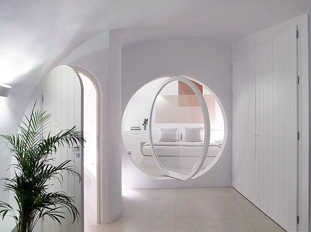 Внутри вы обнаружите гостиную с небольшой кухней, две ванные комнаты и сауну. Дизайнеры воспользовались органическими кривыми жилища и создали скульптурные интерьеры. Одна из спален с ванными комнатами имеет круглую стеклянную дверь, которая тонко отмечает переход между социальной и частной зонами.
