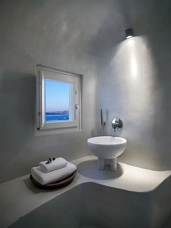 Внутренние и наружные стены были построены из вулканических камней и белой штукатурки, а полы имеют светло-бежевый мрамор и цементную штукатурку. Хорошо подобранные материалы и текстуры во всем добавляют к оригинальности этого дома скалы в Греции. Фотография Вангелиса Патеракиса.