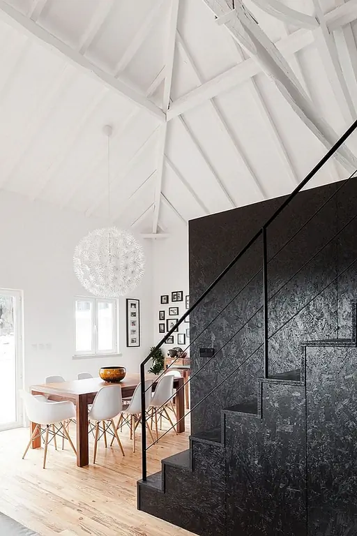 «Эта« мебель »имеет основополагающее значение в разделении социальной зоны на первом этаже, разделяя пространство между зоной входа, гостиной, столовой и кухней», - объясняют дизайнеры. «Верхний этаж, который служил для сушки зерна в прошлом, теперь выходит на социальную сферу и работает как пространство для отступления и рабочая зона».