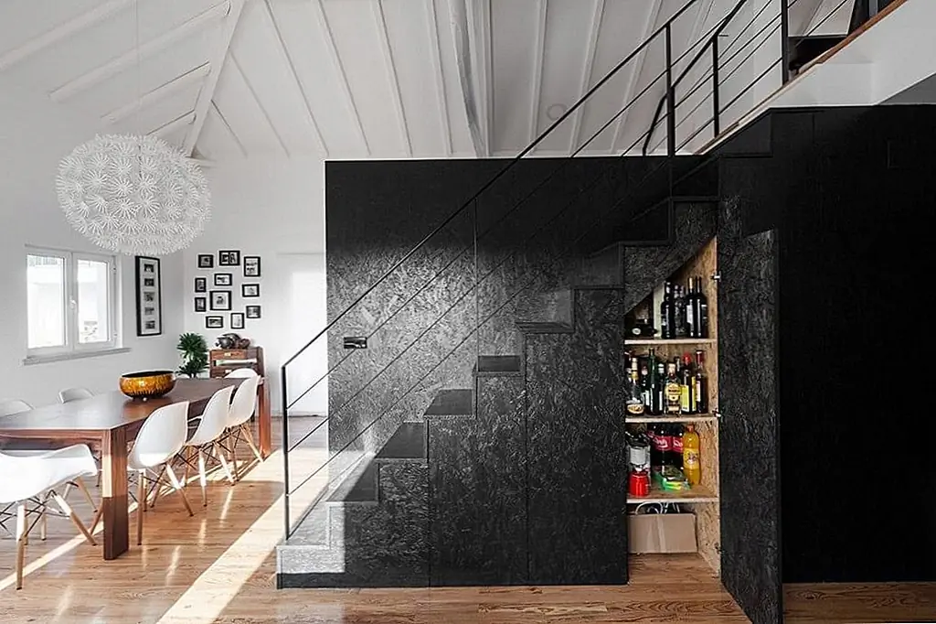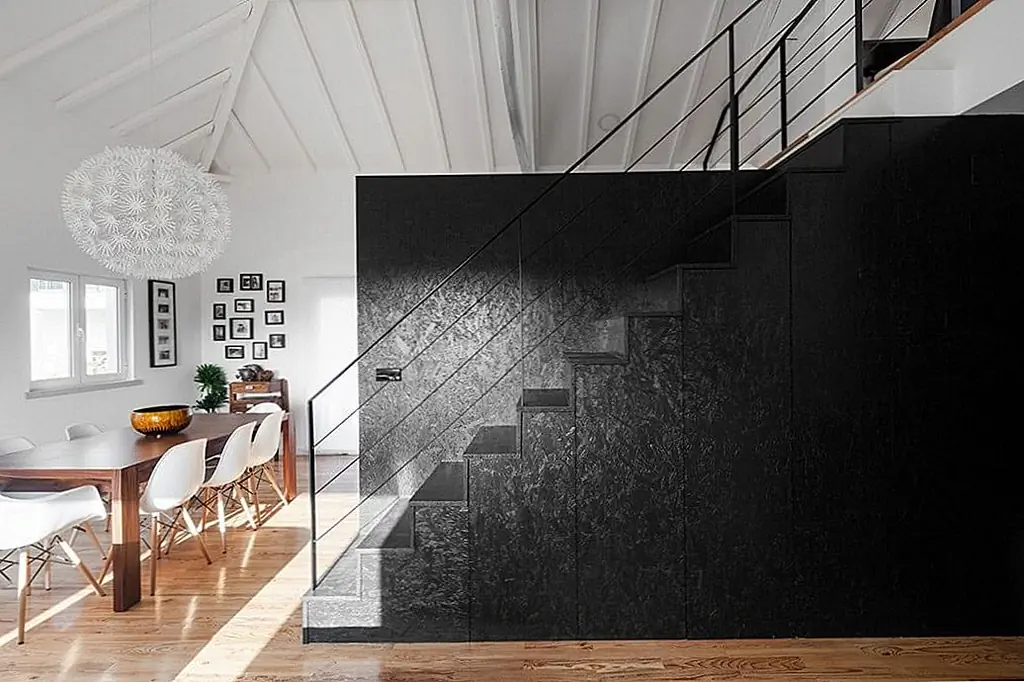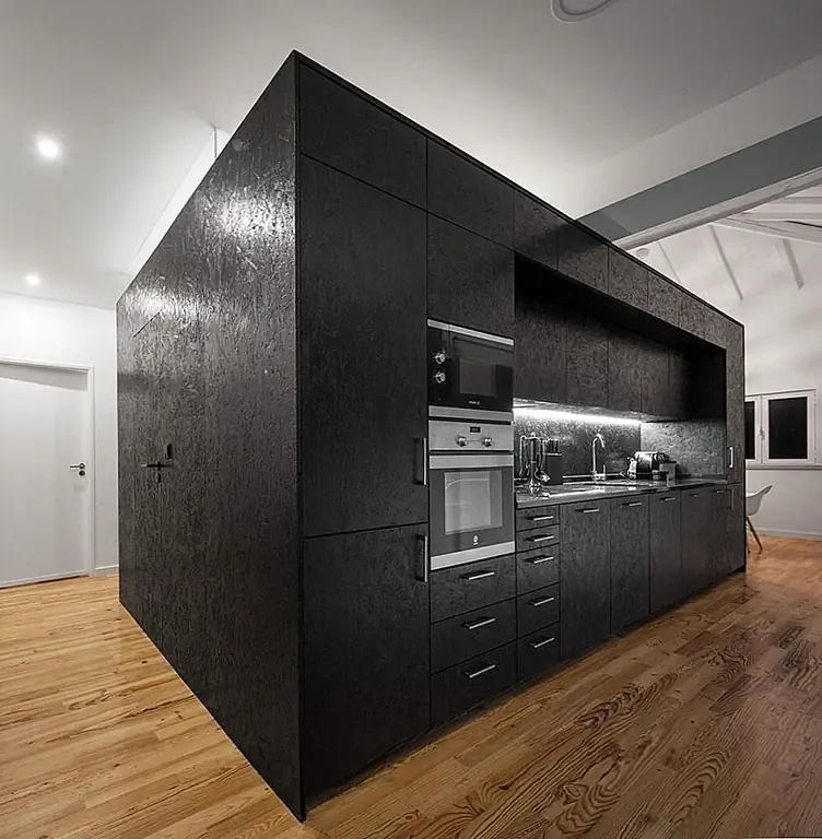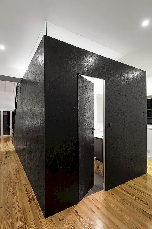 Несомненно, фокус этого проекта - «черный ящик» посередине; он служит как эстетической подсветкой, так и функциональным элементом. Именно в этом нетрадиционном томе встроены кухня, туалет, склад и лестница.