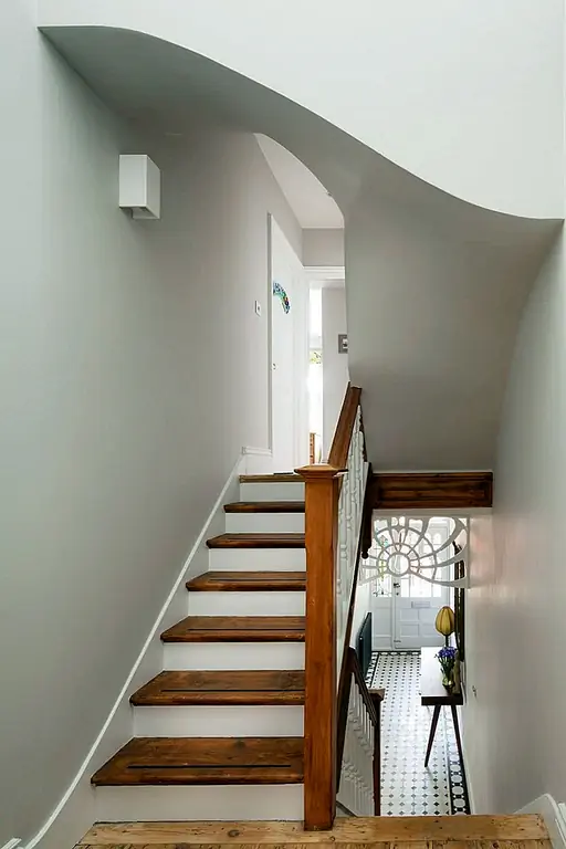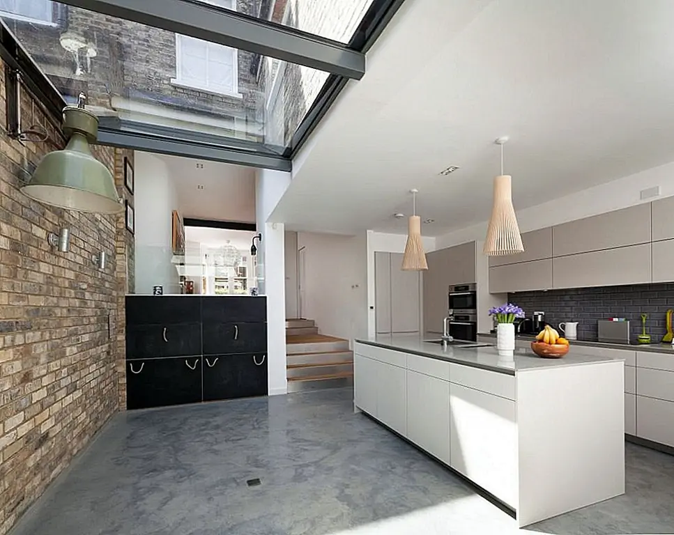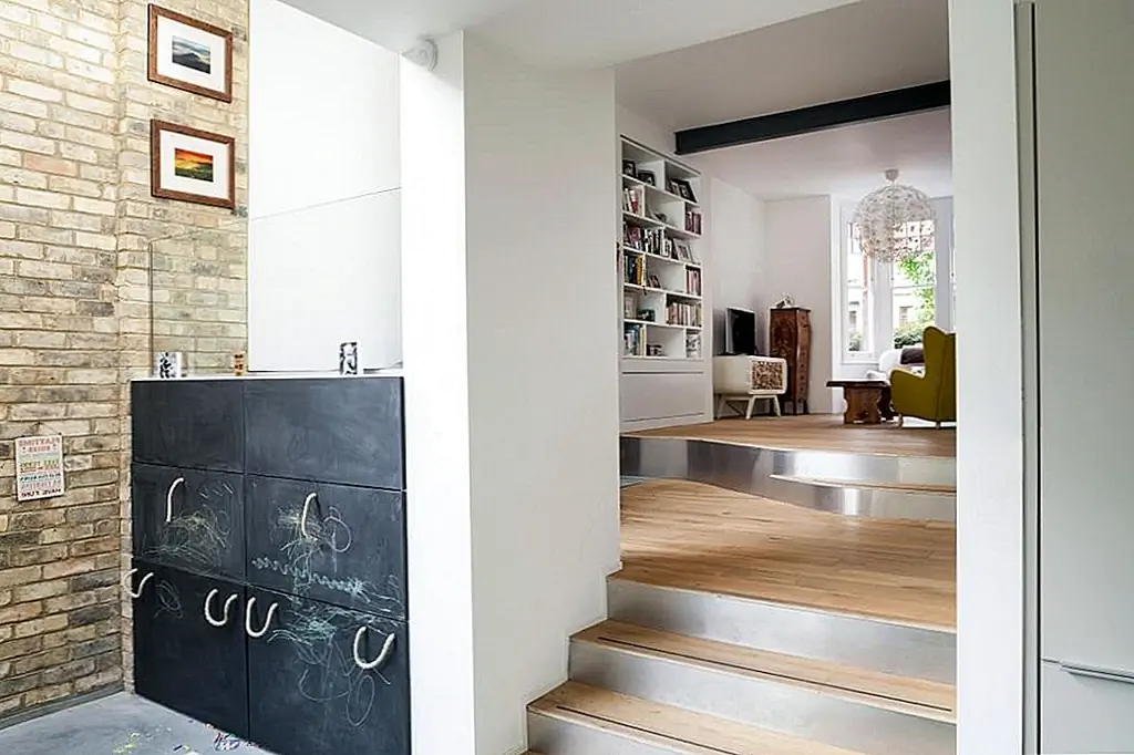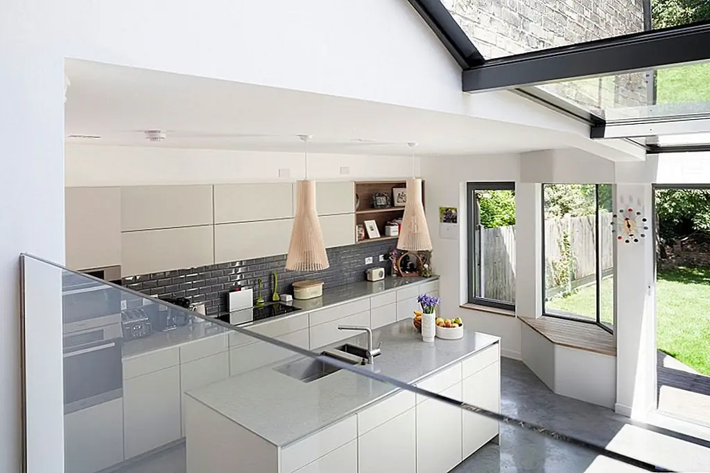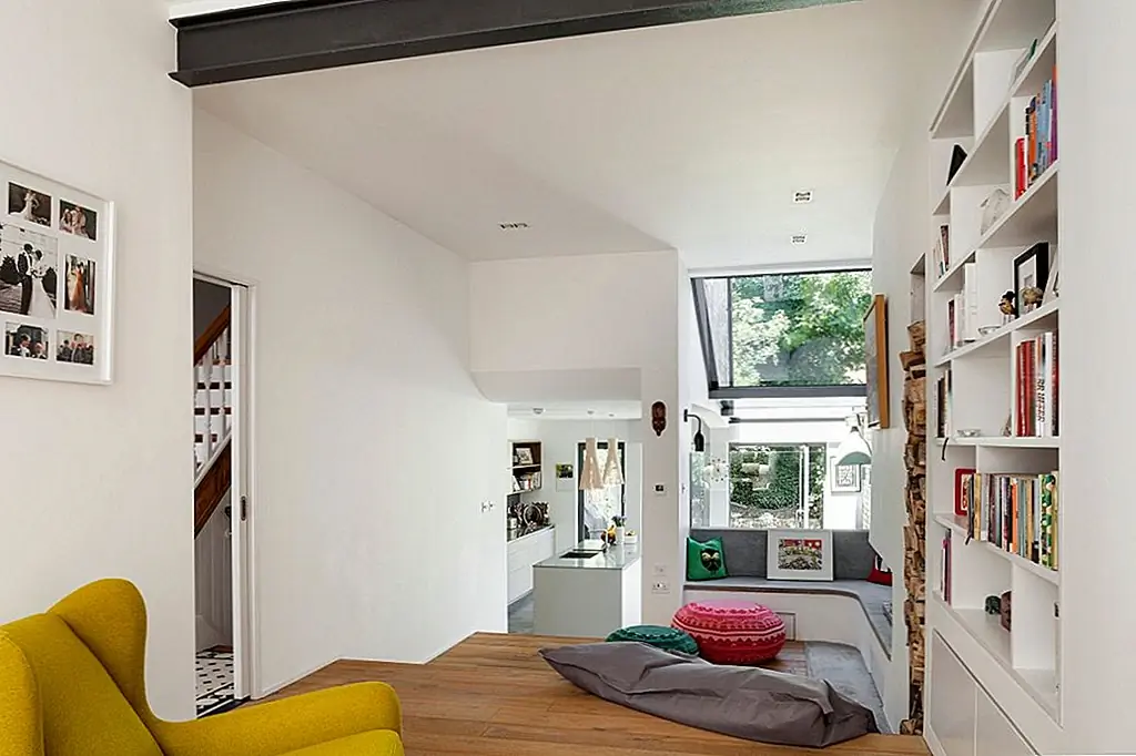 «Открывая внутреннюю структуру, сохраняя функцию ранее разделенных областей, дом мгновенно чувствует себя более открытым и гостеприимным», - сказали они. «Есть поток от фронта к спине, продолжающийся в сад; несмотря на выходящую на север заднюю возвышенность, умное расположение окон позволяет естественному освещению на кухне ».