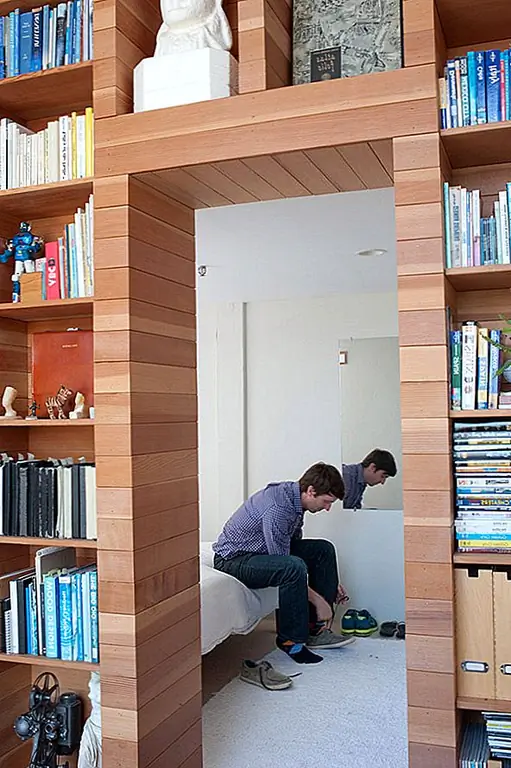 Домовладельцы и дизайнеры Линда и Питер Бенуа(из Архитекторы Melander) приступили к сложной задаче ремоделирования плохо спланированного ложа на 1,100 квадратных фута, расположенного на бывшей фабрике паровых машин в Эмеривилле, штат Калифорния. Фокус и одно из самых творческих дополнений нового дома - мастерство Петра:полностью настроенный деревянный ящик размером 16 на 17 дюймов, который вмещает книжный шкаф снаружи, спальню внутри и мезонин гардеробной«. Доступ в «скрытую камеру» обеспечивается боковой лестницей, идеально интегрированной в общий дизайн. Этот проект box-in-box захватил наше внимание и заставил нас искать дальнейшие подробности. Вы можете наблюдать многофункциональное дополнение от различных точек стояния на фотографиях ниже и судить о себе, если эта необычная спальня практична или, наоборот, занимает слишком много места. Проект найден на: Dwell