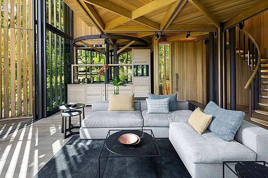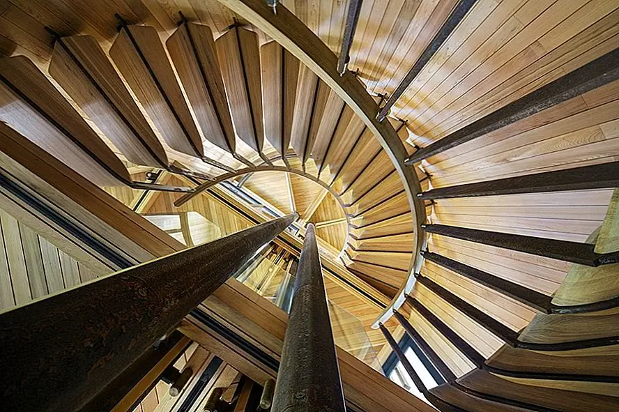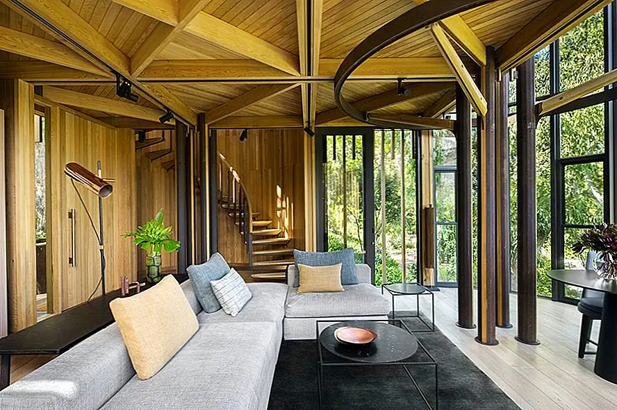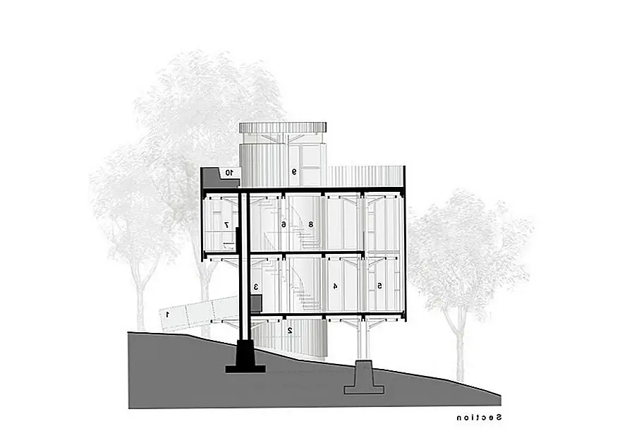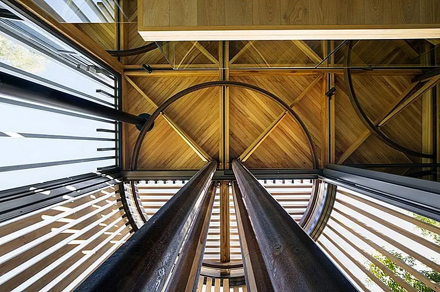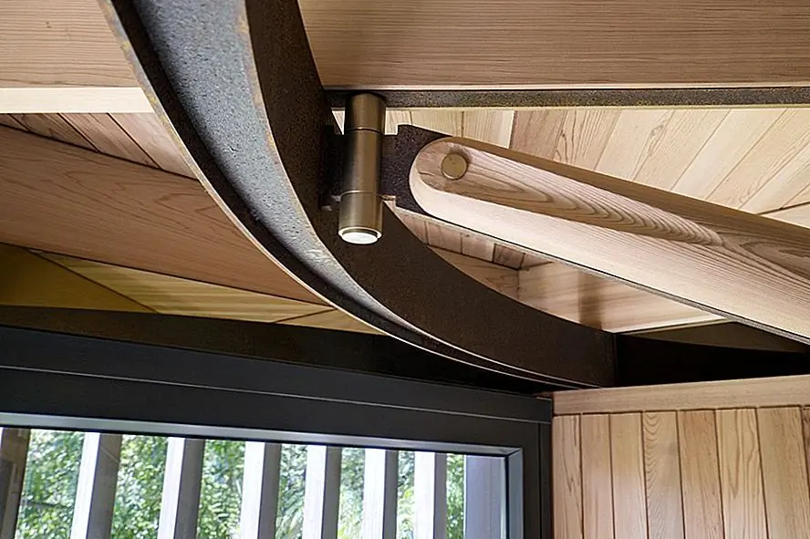 Стальные колонны, кронштейны и кольца Corten поддерживают полы и тяжелые окна. Говорят, что все материалы остаются необработанными для изменения оттенков с течением времени.