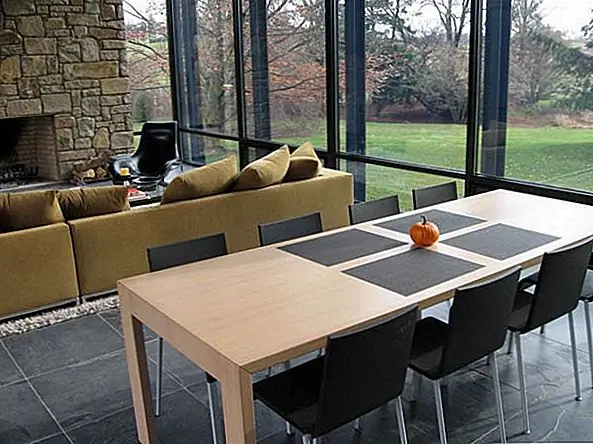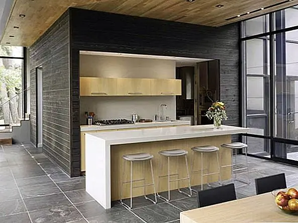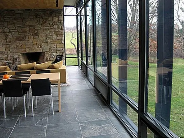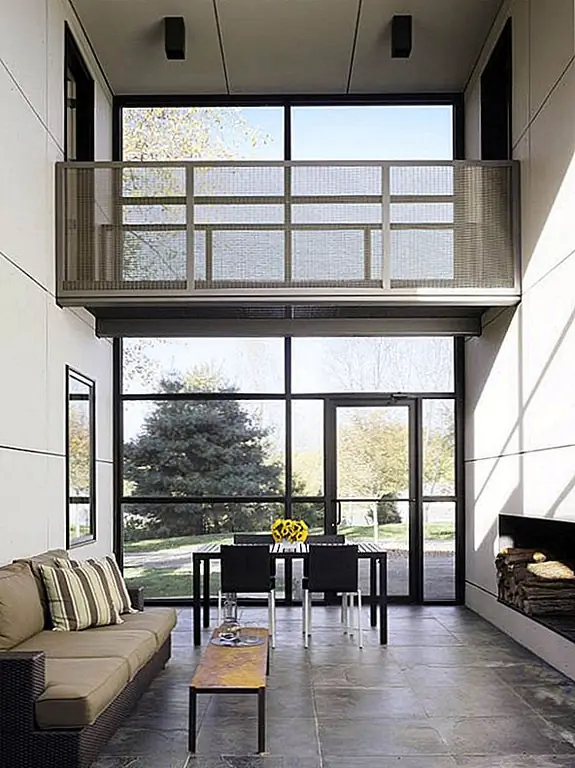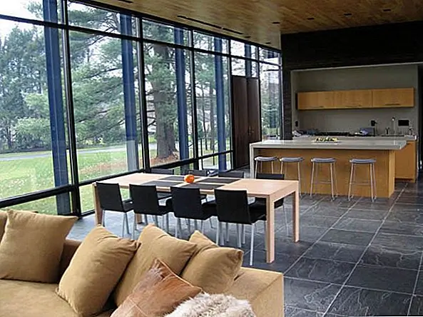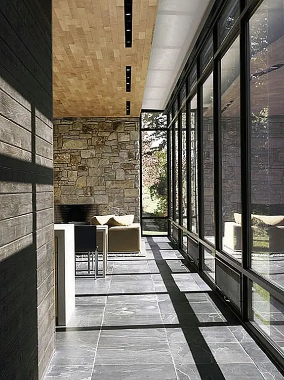 Лучистые полы и пассивное солнечное отопление помогают каменному дымоходу предлагать комфорт в летние месяцы. Так архитекторы описывают свое японское творчество:Хотя каждый том очень прост в своей форме, обмен между ними позволяет использовать широкий спектр пространственных переживаний. Первое впечатление о том, что в доме есть две «теневые коробки», связанные «клеткой для птиц». Однако, когда вы входите в дом, восприятие меняется. Изнутри клетка больше не фигура, а зеркало снаружи. Одноэтажный мастер-комплект становится интимным ореховым валиком, отступающим от открытой стеклянной гостиной. Драматический перфорированный стальной мост, проходящий через двухэтажное экранированное крыльцо, доходит до гостевой комнаты. В северном конце дома есть отдельный балкон, смотрящий вниз на бассейн для коленей, расположенный в лесу.”