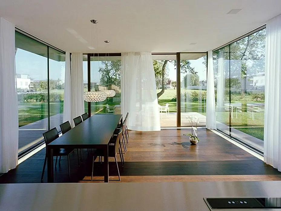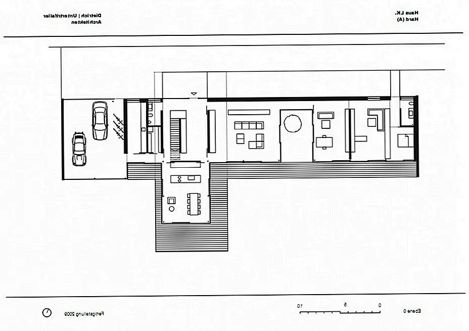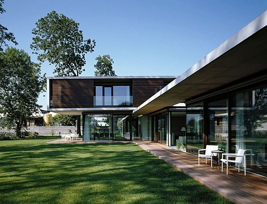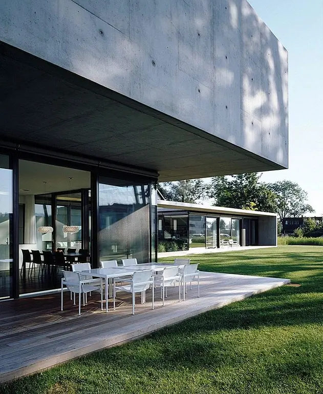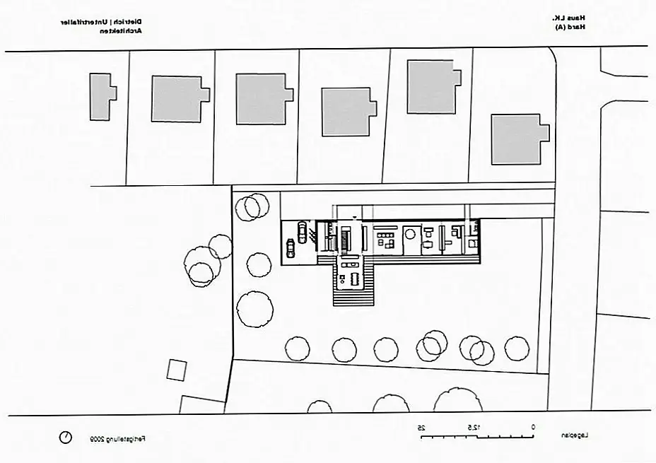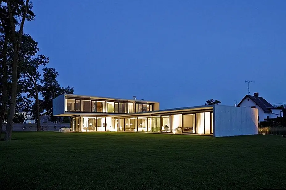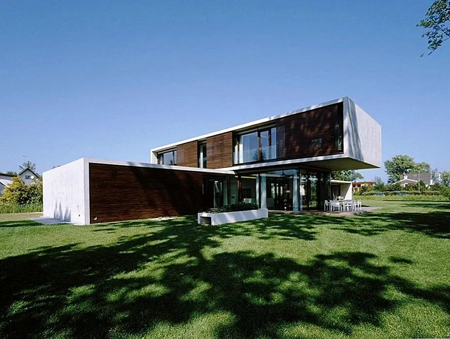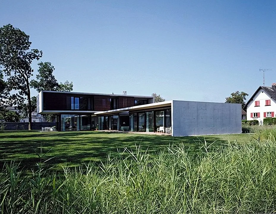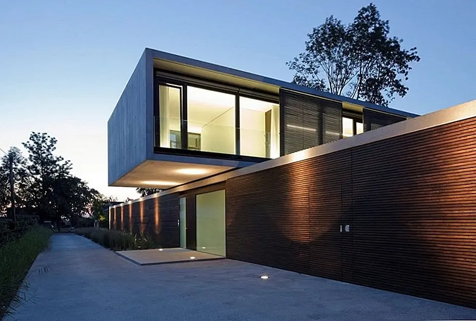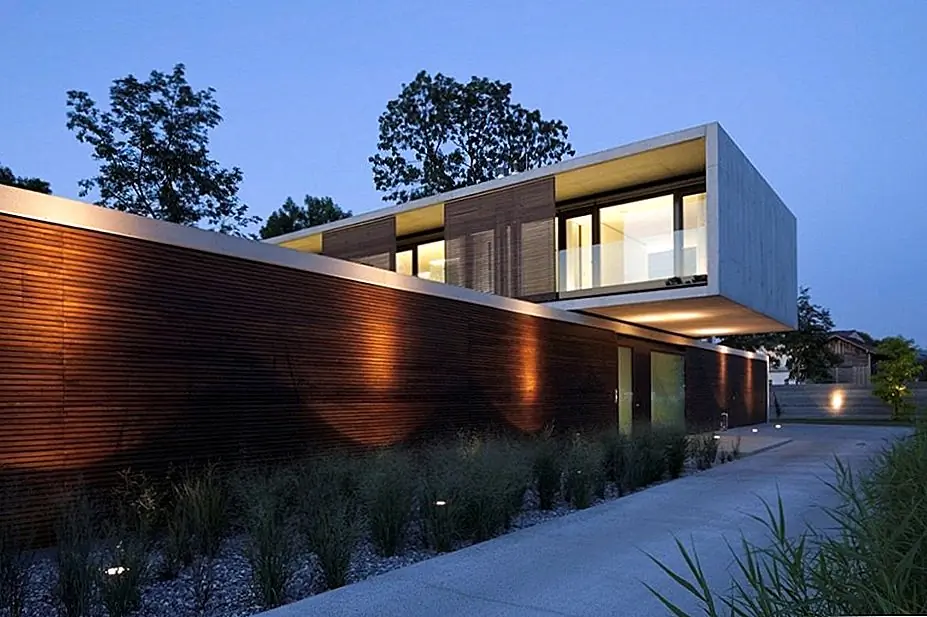 Игра двух томов, уложенных один поверх другого, была проектом дизайна, направленным Архитекторы Дитриха Унтертрифаллера для LK House в городе Хард, Австрия. «Ящики» частично обернуты бетоном, грубым материалом, контрастирующим с обширным остеклением и деревянными панелями. Чувство легкости развязывается по всей резиденции, несмотря на ее внушительную внешность. Архитектурное решение дает возможность жителям насладиться разнообразной перспективой окружающей среды, не нарушая конфиденциальности.