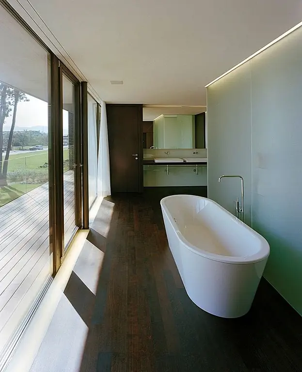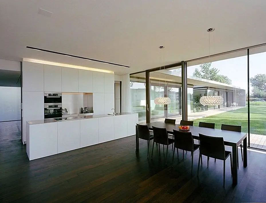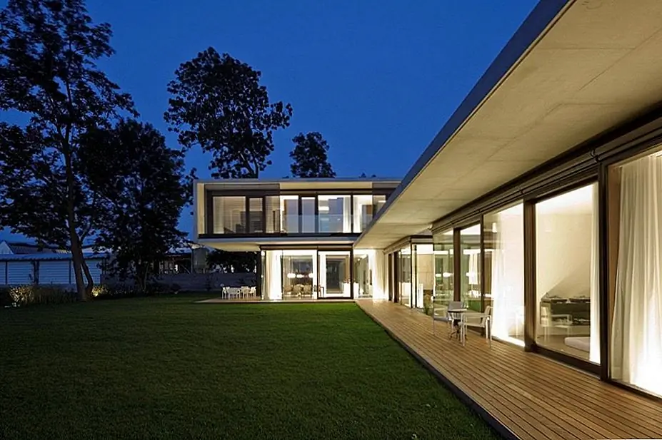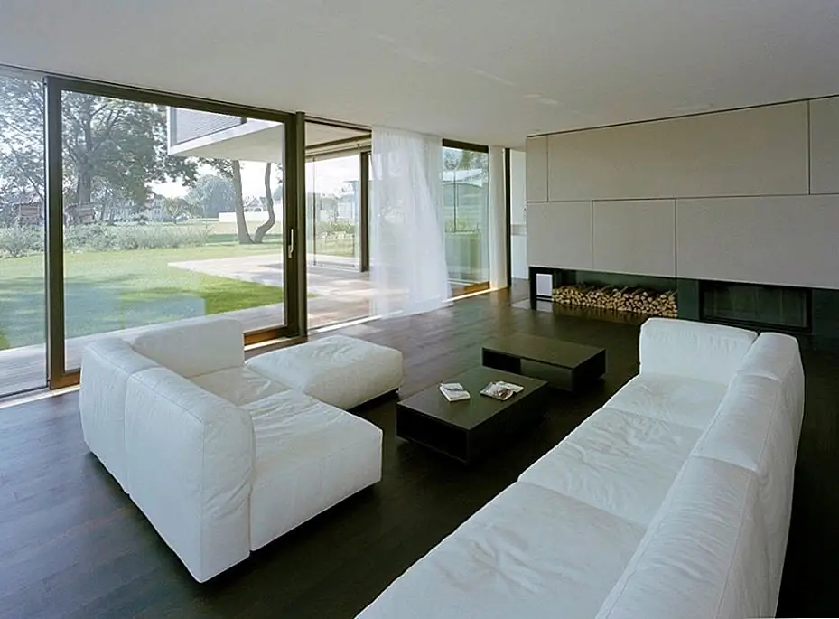 Когда вы входите внутрь, вы заметите сильный контраст между несущественными белыми потолками и темными полами в копченом дубе: «Абитуриент сразу видит пространственную компоновку, когда она эмулирует форму здания снаружи. От входа на перекрестке между нижним этажом и верхним этажом, расположенным в ортогональном направлении на один этаж выше, разметка коридора в коридоре может быть выделена на двух уровнях ». На первом этаже расположены жилые помещения, а обеденная зона проецируется в сад, в соответствии с верхней строкой, выходящей из здания. Спальни на верхнем уровне предлагают панорамный вид на близлежащее озеро. [Фотография: Бруно Кломфар]