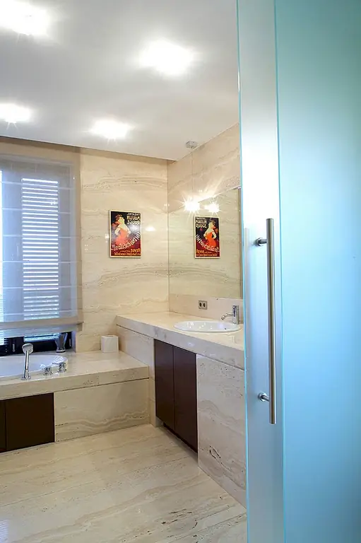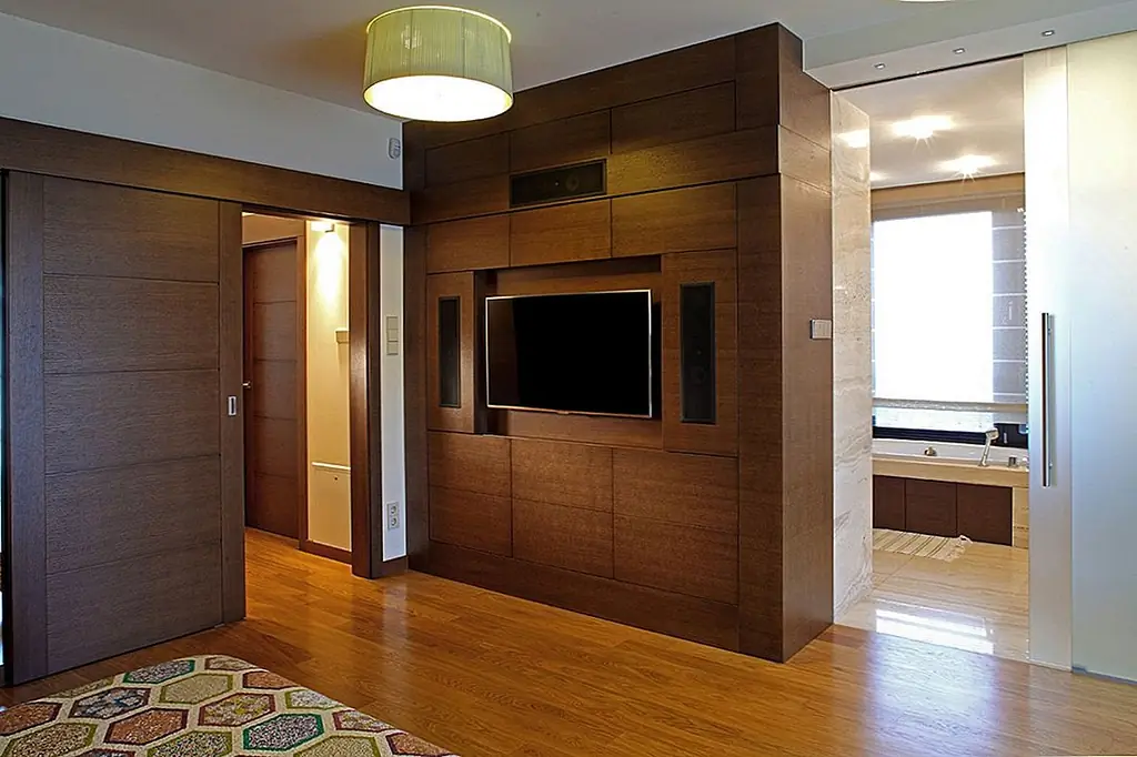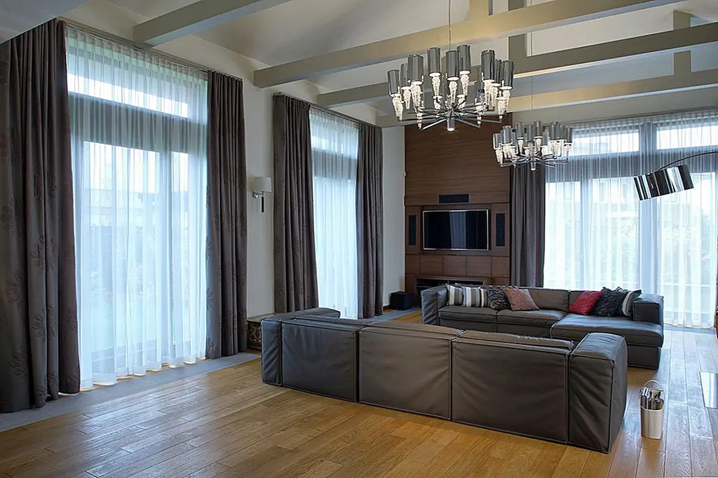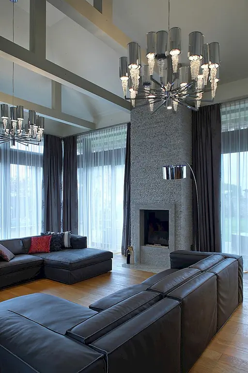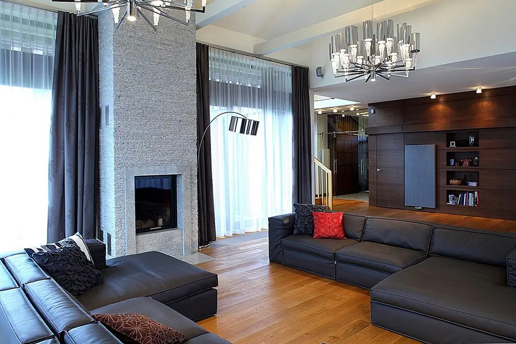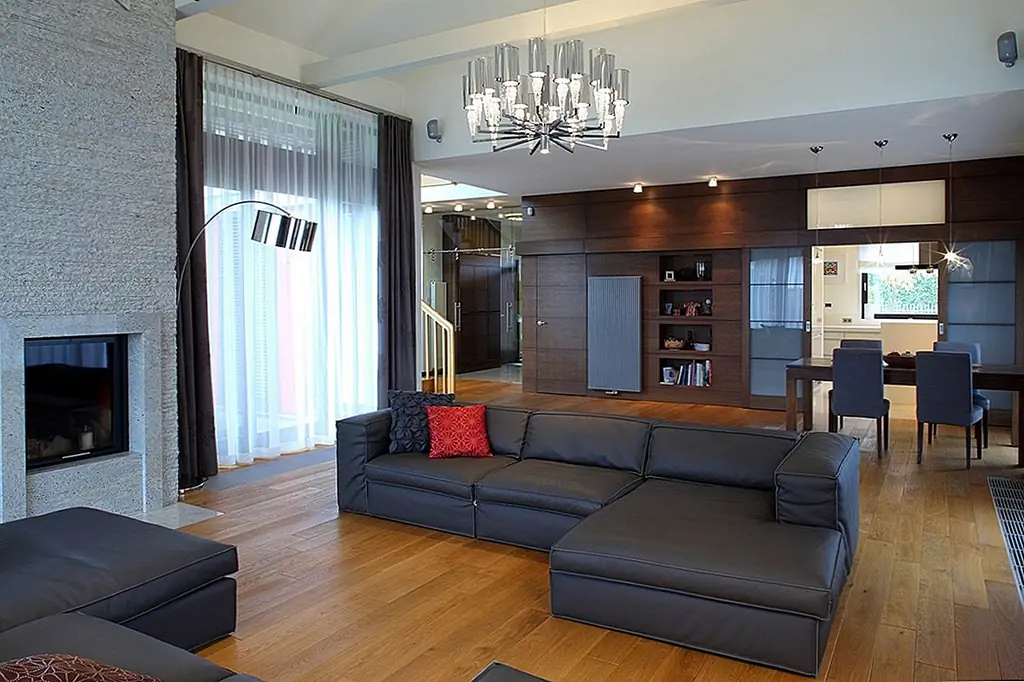 Две огромные подвесные люстры, расположенные под наклонной крышей, приносят личность. Очень высокий камин из серого гранита заполняет узкое пространство между окнами. Темные кожаные диваны контрастируют с дубовыми полами. Сочетание вершин Corian и стеклянных фасадов шкафов создают современное кухонное пространство с большим количеством света, проходящего через окна. Туалет отделан красным травертином и цветным дубом. Все отделочные материалы, которые использовались на первом этаже, также используются на втором. Есть две комнаты для домашнего кинотеатра, первая в гостиной и вторая в главной спальне. Деревянная дубовая лестница ведет к адаптированному чердаку, что помогло увеличить площадь дома с дополнительными 80 квадратных метров. [Информация предоставлена по электронной почте Роландом Станчиком; Фотографии: Томаш Марковски]
