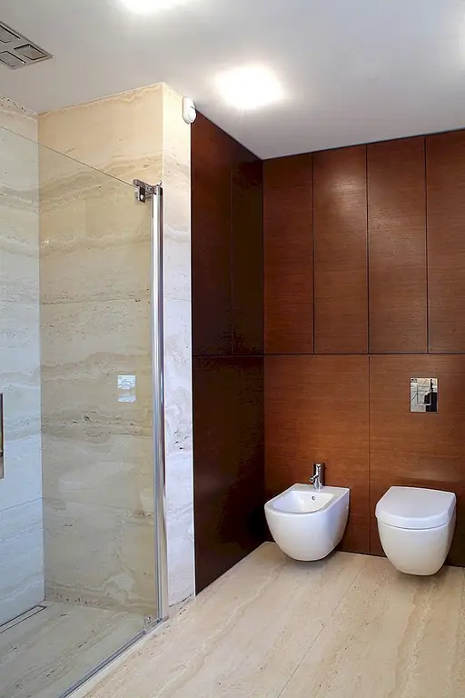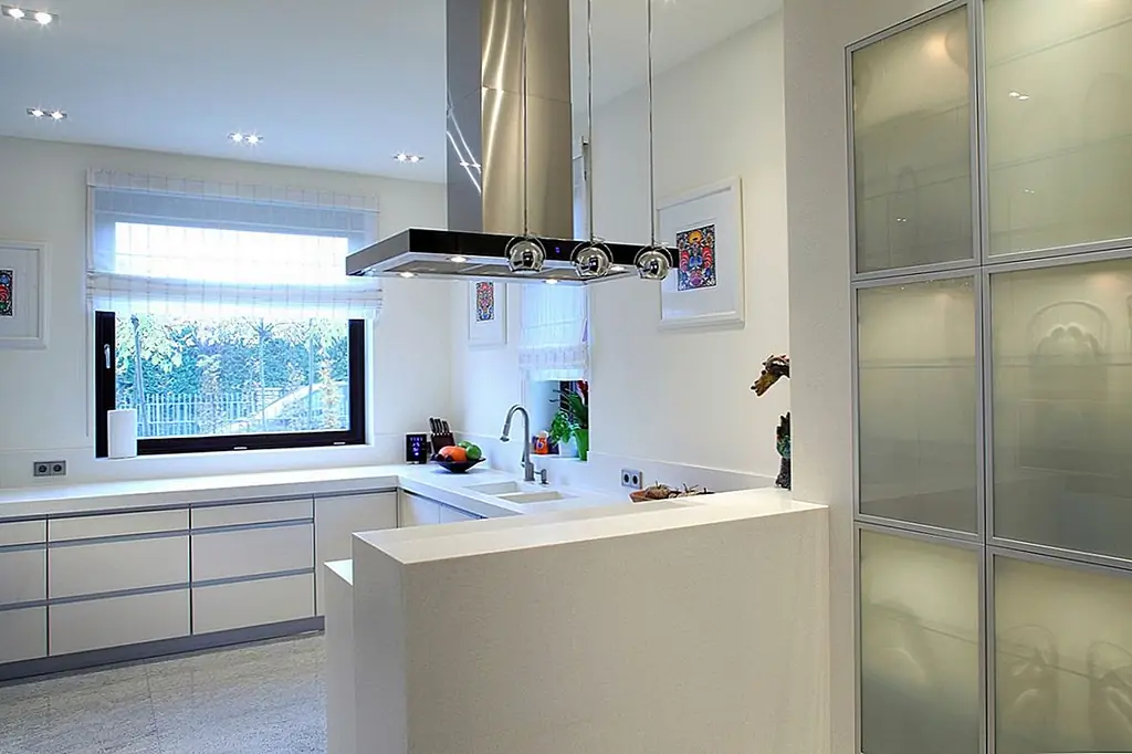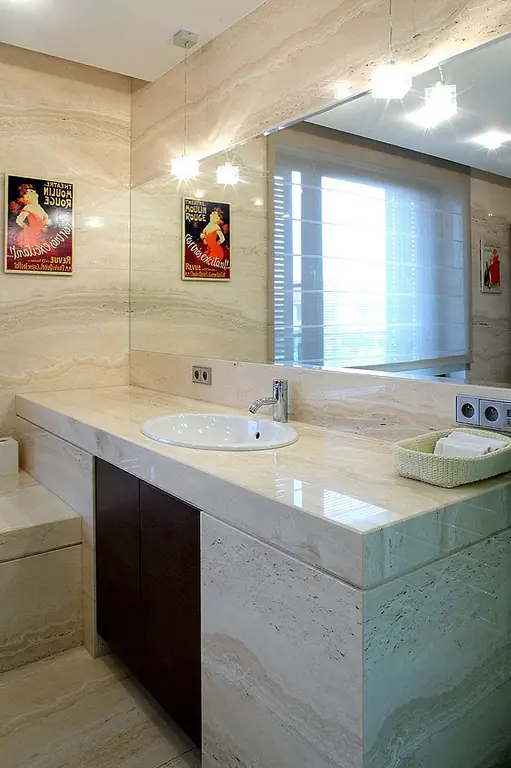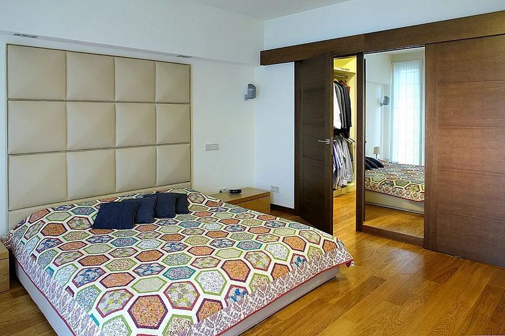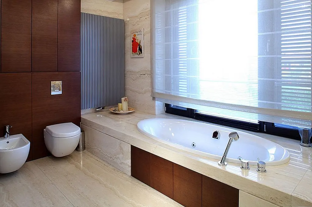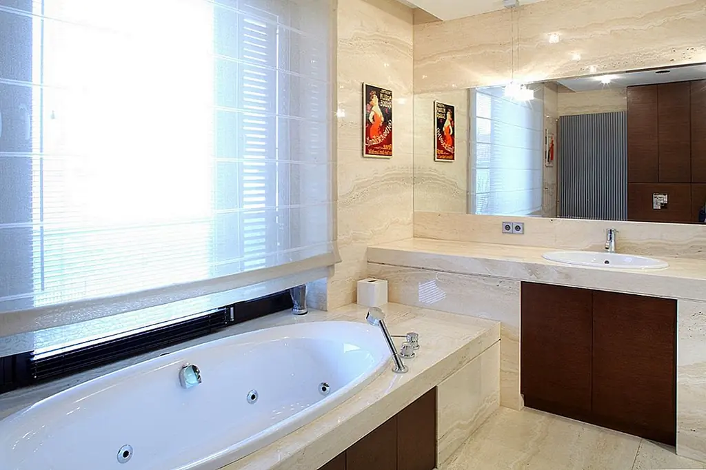 Две огромные подвесные люстры, расположенные под наклонной крышей, приносят личность. Очень высокий камин из серого гранита заполняет узкое пространство между окнами. Темные кожаные диваны контрастируют с дубовыми полами. Сочетание вершин Corian и стеклянных фасадов шкафов создают современное кухонное пространство с большим количеством света, проходящего через окна. Туалет отделан красным травертином и цветным дубом. Все отделочные материалы, которые использовались на первом этаже, также используются на втором. Есть две комнаты для домашнего кинотеатра, первая в гостиной и вторая в главной спальне. Деревянная дубовая лестница ведет к адаптированному чердаку, что помогло увеличить площадь дома с дополнительными 80 квадратных метров. [Информация предоставлена по электронной почте Роландом Станчиком; Фотографии: Томаш Марковски]