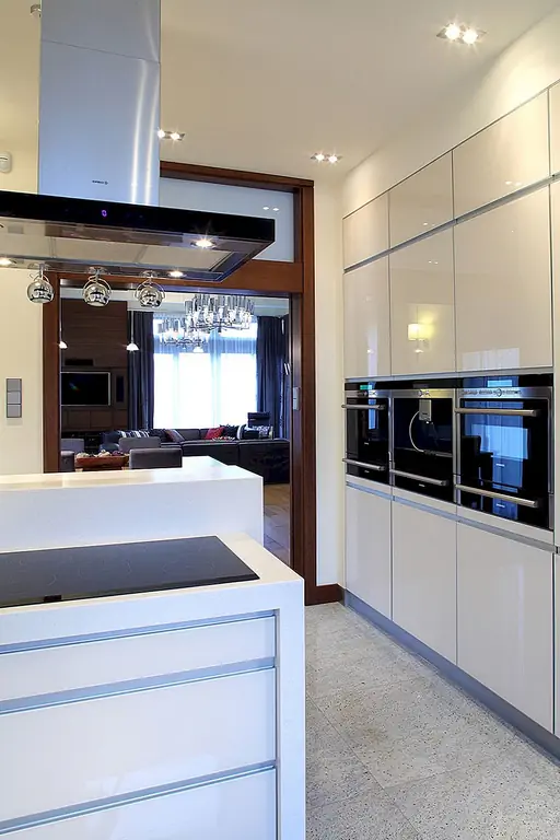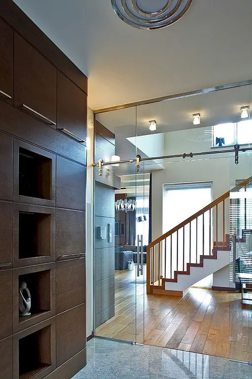 Этот дом площадью 300 квадратных метров, предложенный Роландом Станчиком, расположен в закрытом сообществе в 20 километрах от центра Варшавы, Польша. Отдел внутреннего пространства был перестроен в сотрудничестве с дизайн-студией APA Kury? Owicz до того, как был построен дом. Первый этаж создает одно открытое пространство. Прихожая отделена от гостиной стеклянной стеной. Высокие окна и высокое пространство над гостиной оказали решающее влияние на характер интерьера первого этажа. Вся мебель, отделанная цветным дубом, была специально разработана для этого пространства.