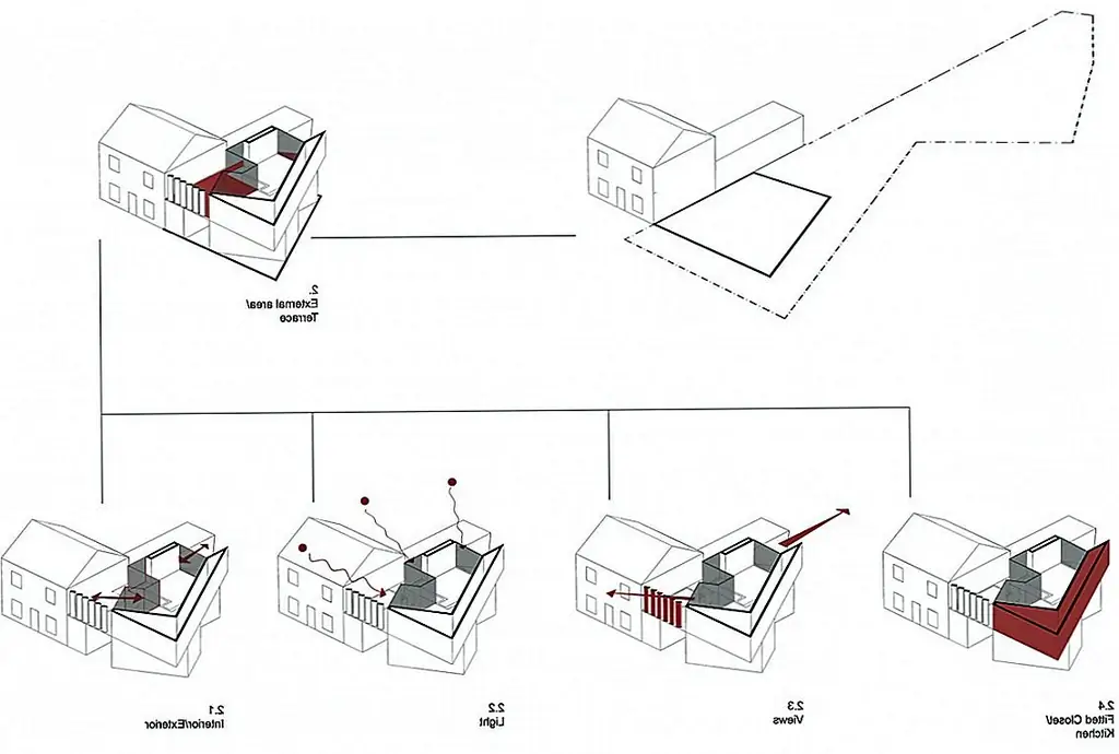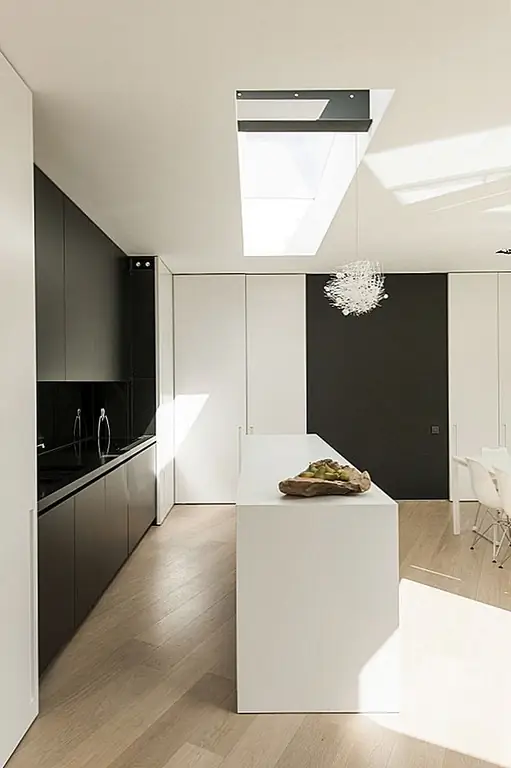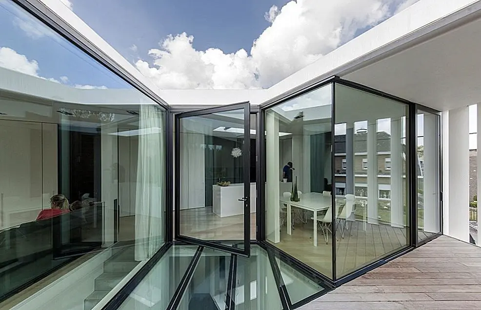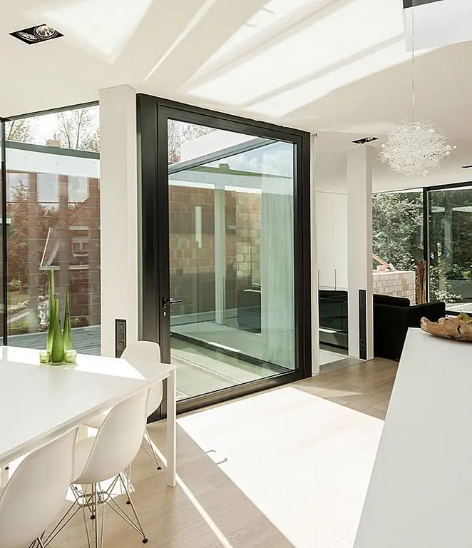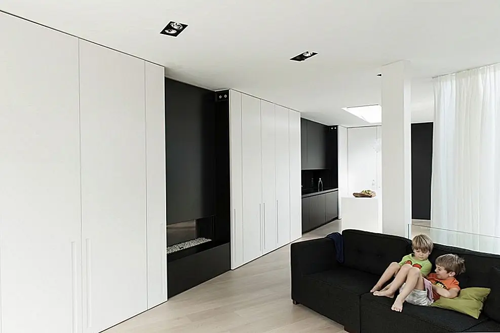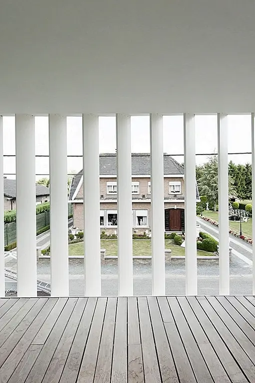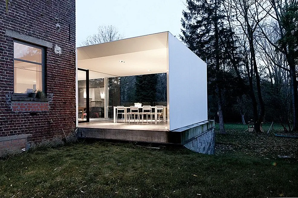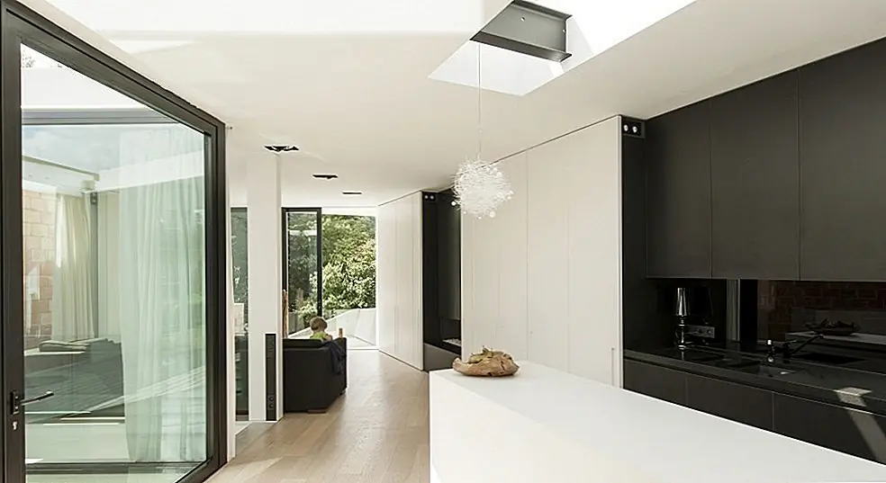 По словам архитекторов, которые разработали House K (первоначально обнаруженный Freshome на Flodeau) «Запрошенная программа с ограниченным жизненным пространством вылилась в дом внутреннего дворика с обильным светом. Выбирая это понятие, южное солнце вторгается вглубь дома. Жилая площадь наверху связана с террасой, выходящей на юг. Маленькая терраса в задней части дома составляет вид на лесистую местность ». Вход, спальня, ванная комната и кладовая находятся на первом этаже ». Прекрасная терраса, ограниченная белыми платами, расположена на верхнем уровне и обеспечивает выгодную точку над соседней зоной.