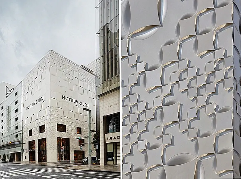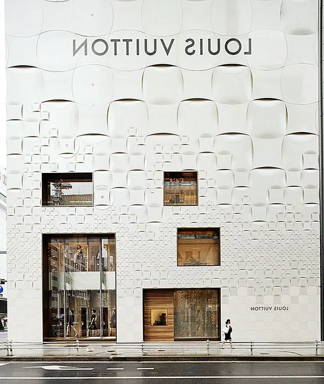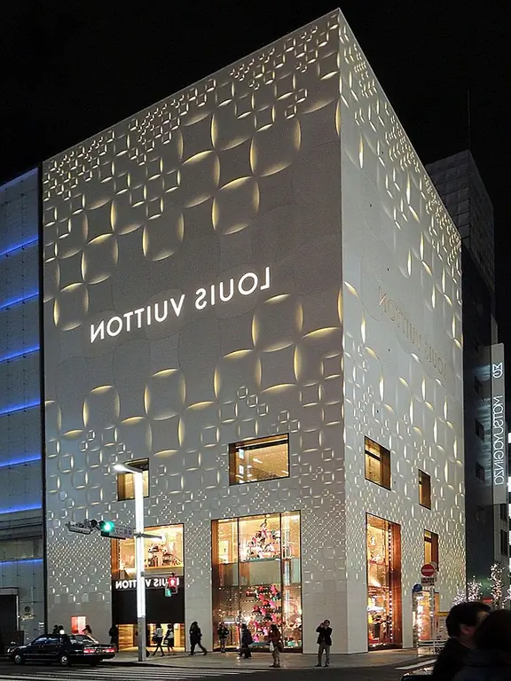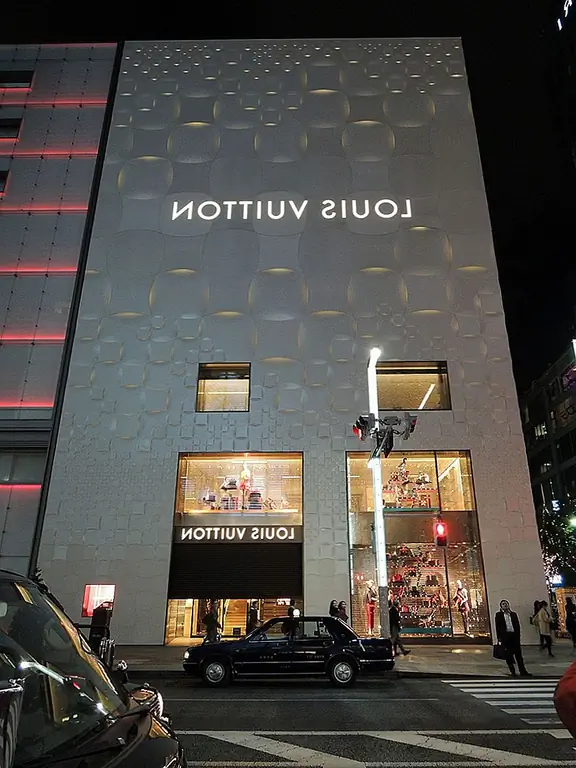 Новый фасад Louis Vuitton Matsuya Ginza в Токио, как говорят, вдохновляет история Гиндзы, города, который раньше был известен своим дизайном в стиле ар-деко. По словам известного японского архитектора Июнь Аоки, творческий ум за новой разработкой, Гинза был входом в Токио, рядом с Шимбаши, из которого самая первая железнодорожная станция Японии простиралась до порта и вела к чужой стране. Геометрическая облицовка здания вдохновлена логотипом Damier от Louis Vuitton в отношении эдо-комона, образцом традиционного Токио.