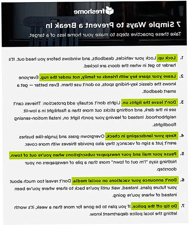 «Не сообщайте никому, кто спрашивает о вашей домашней безопасности. Если кто-то, претендующий на роль продавца, приходит к вам или звонит в ваш дом, спрашивая о вашей домашней безопасности, вежливо отключайте их. Человек может быть законным продавцом из фирмы по обеспечению безопасности в надежде на продажу, или что вызывающий может быть потенциальным взломщиком, надеющимся найти незащищенные дома ».