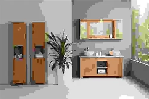 Сочетающиеся деревянные шкафы для хранения создают красивый целостный вид и могут вместить самые разные предметы, от туалетных принадлежностей до запасных полотенец и всего, что между ними, поэтому деревянная тумба с дополнительным высоким шкафчиком может стать идеальным решением для хранения в ванной комнате..