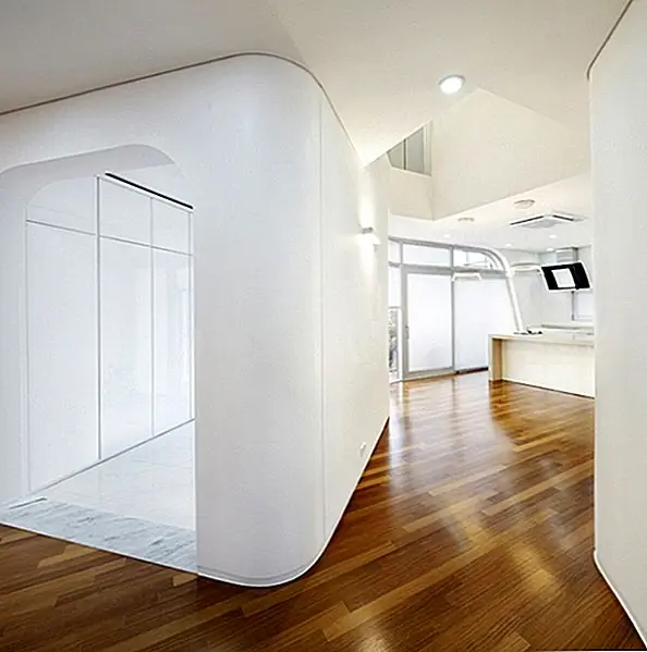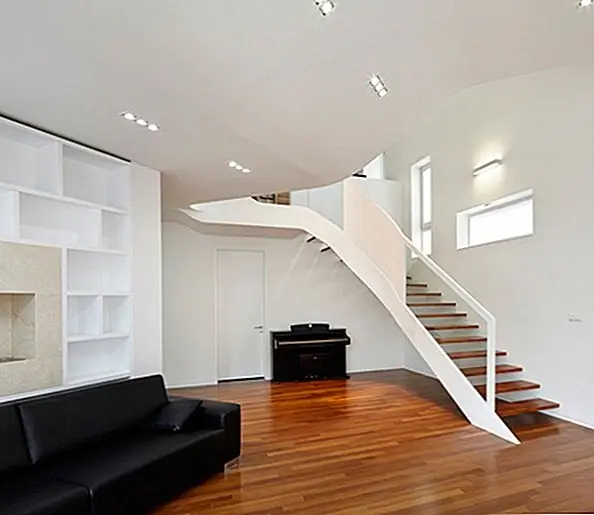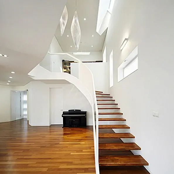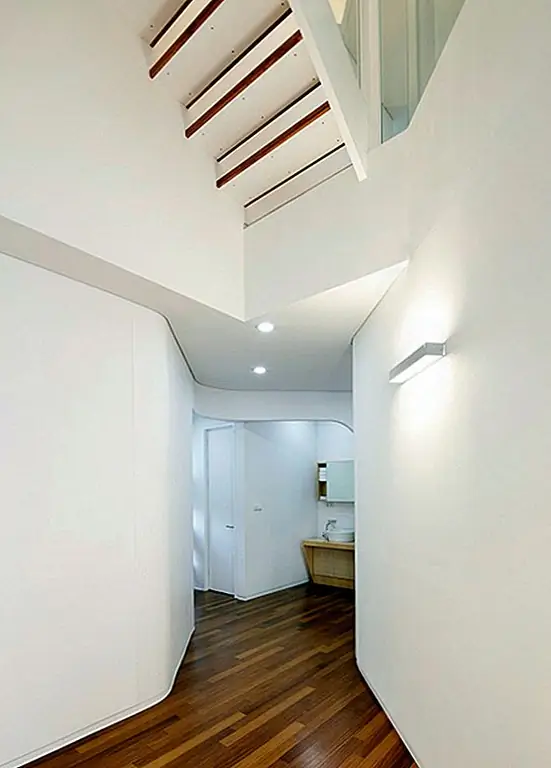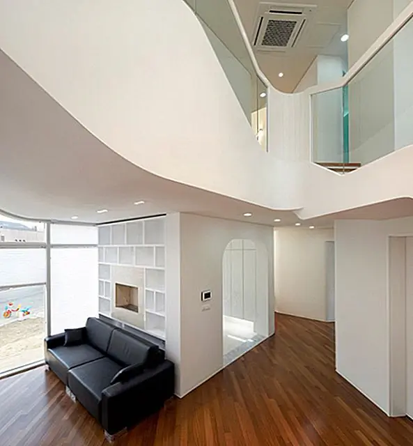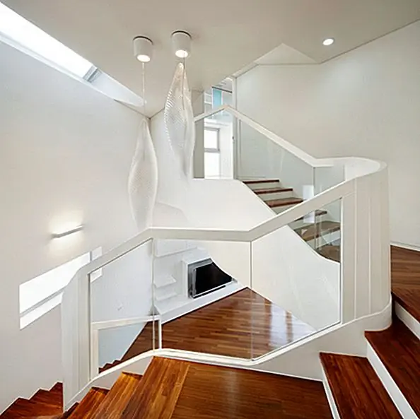 Используя одну из новых технологий строительства, акриловые каменные панели Hi-Macs, архитекторы получили эту аккуратную и трехмерную экструдированную поверхность, усиливая ощущение глубины. Внутри каждый край кажется пышным и округлым. В структуре этих домов нет ничего регулярного: «плавающий» потолок (волнообразная поверхность нерегулярной формы), научно-фантастическая лестница (все изогнутые с вырезами) и одноклеточные жгутиковые простейшие виды ламп создают очень необычное пространство для того, что это выглядит семейным домом. Архитекторы также интегрировали некоторые отделки древесины. Изысканный и необычный, дом Pangyo абсолютно потрясающий!