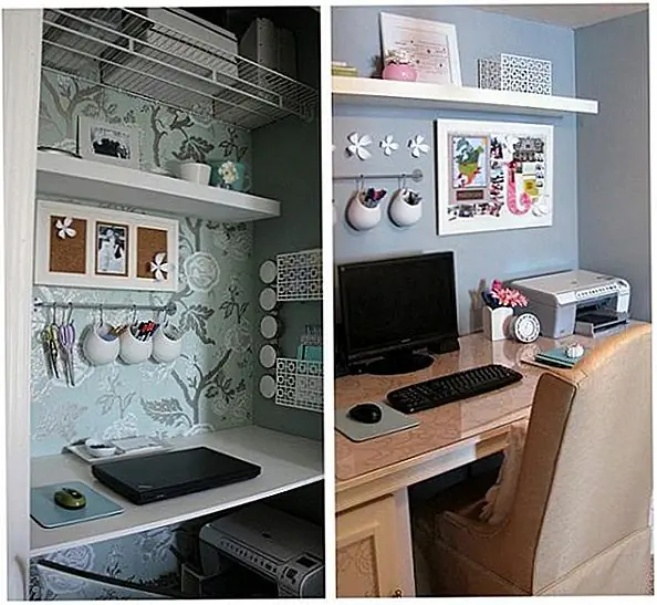 - Необычный вариант может быть идеальным для вас: Если пространство, которое вы используете, слишком мало, подумайте о том, чтобы использовать шкаф в качестве офисного пространства! Эта новая тенденция - отличный способ добавить место, где вы, возможно, не рассмотрели. Для максимального вертикального пространства снимите штангу и полки одежды сверху. Если вам нужна память, подумайте о том, чтобы оставить полки и / или установить вертикальное хранилище рядом с вашим столом. Удалите дверцы шкафа для дополнительного пространства или, если вы хотите скрыть свой стол, когда он не используется, рассмотрите занавес или двойные складные закрывающиеся двери.