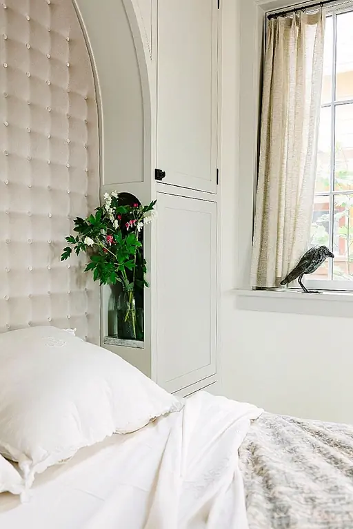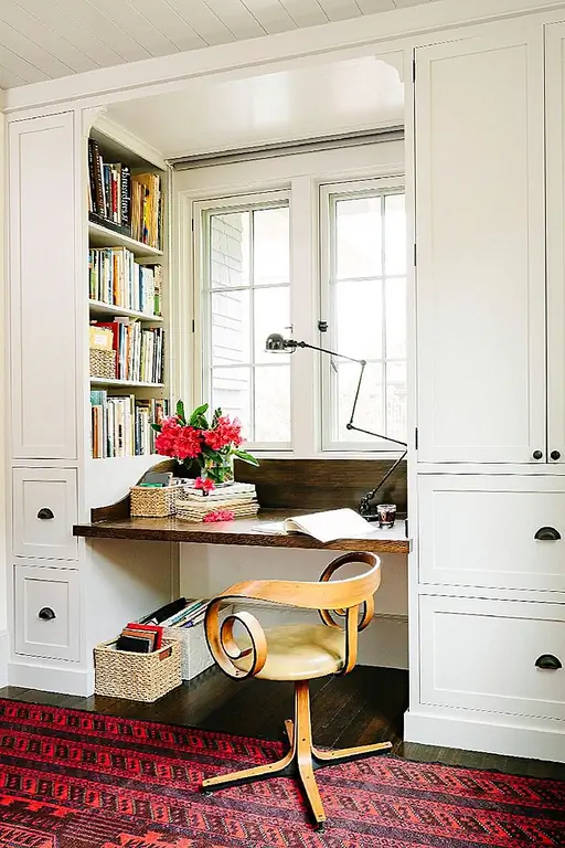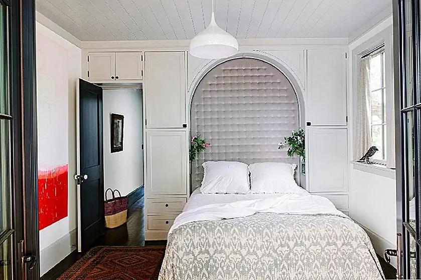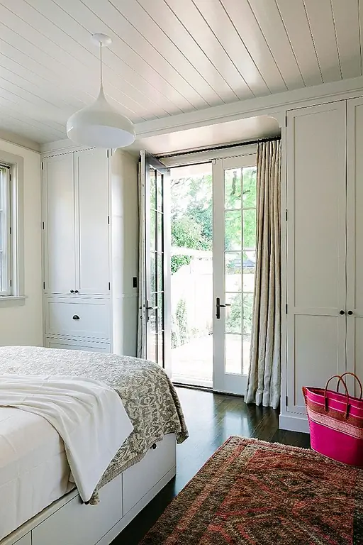 В соответствии с темой оригинальной библиотеки дизайнер добавил полки книг; они определяют вход, обходят обе стороны большой комнаты и окружают маленький стол в гостевой спальне. Поскольку объем основного пространства был таким высоким, библиотечные лестницы на обоих концах комнаты были интегрированы, чтобы обеспечить доступ к высоким полкам. Из-за плотной партии спальни должны были быть довольно маленькими, поэтому дизайнер строил в полезном краснодереве, где это возможно, в том числе вокруг и под кроватью. В обстановке и искусстве представлена теплая палитра драгоценных тонов, в которую входят картины художников Портленда Ани Спилман и Джоселин Рам. [Фотографии и информация предоставлены Джессикой Хелджерсон Дизайн интерьера]