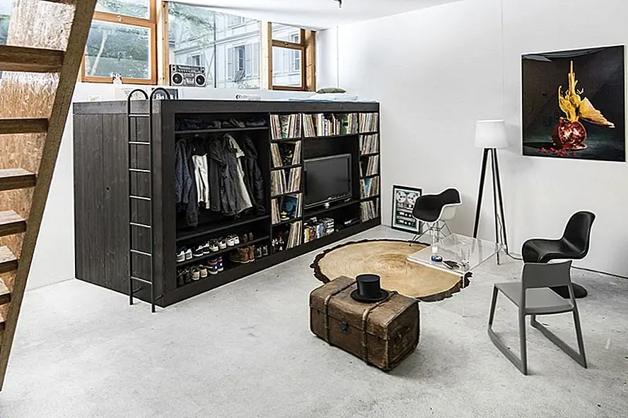 Швейцарский дизайнер Till Konneker of Ill Designs переехал в свою ателье только для того, чтобы обнаружить, что ему не хватает места для хранения. Как и творческий художник, он и есть воображаемое пространство для хранения, достаточно большое, чтобы разместить библиотеку, кровать, шкаф и многое другое - многофункциональный набор мебели для современного дома.