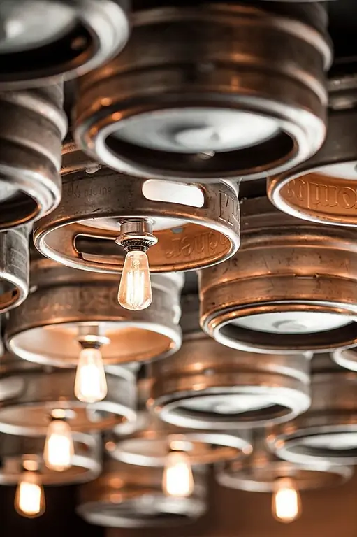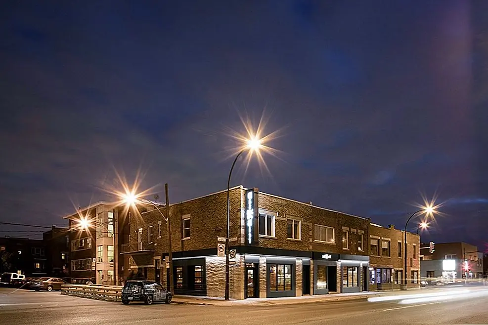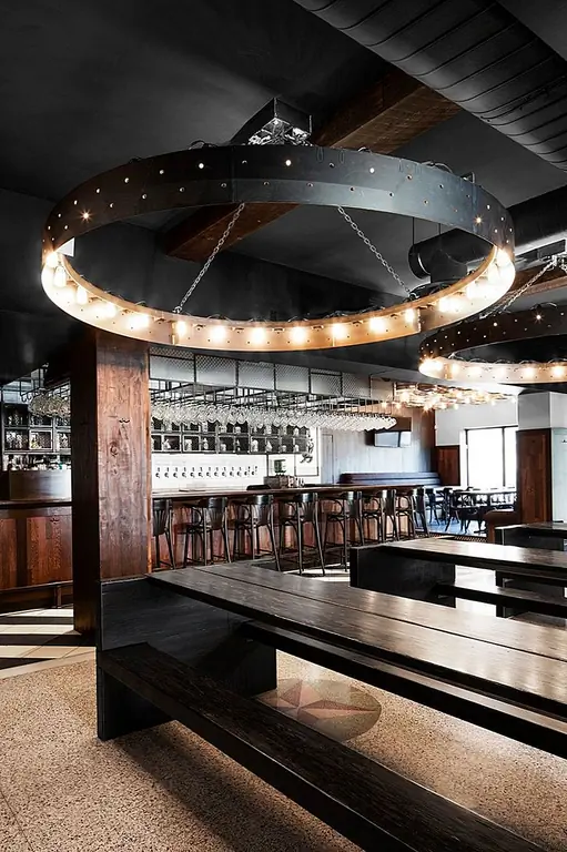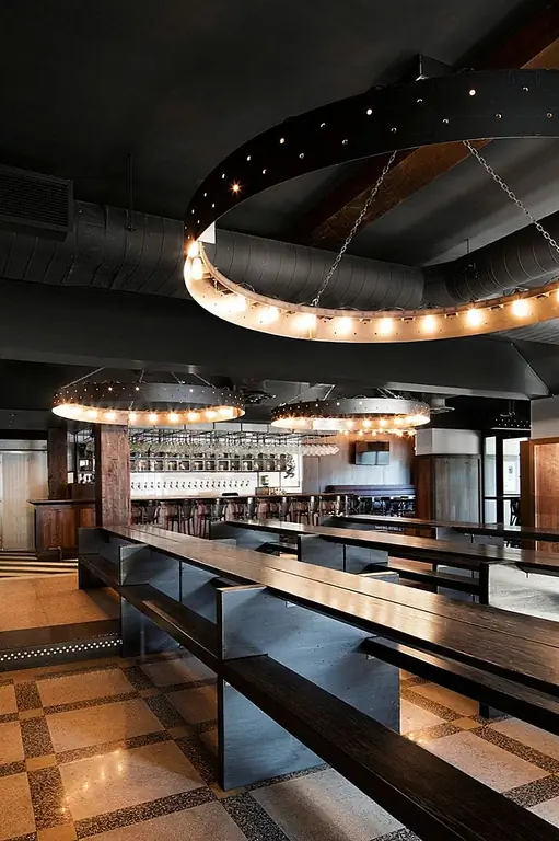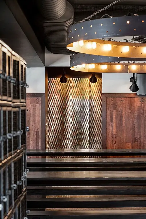 Массивные люстры из горячекатаной стали усиливают атмосферу с мягким освещением, рассеянным сквозь перфорации. Для лестницы и внешнего фасада также использовалась сырая сталь. Интерьеры оживлены благодаря разнообразным материалам и текстурам: от пола Terrazzo и камня до деревянных панелей и алюминиевых бочонков на потолке.