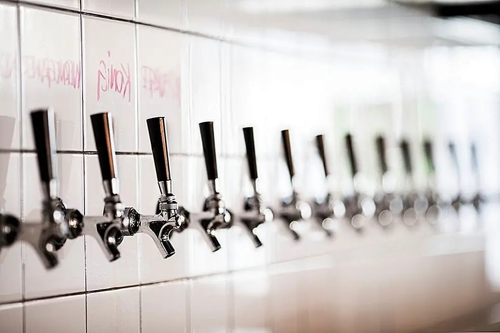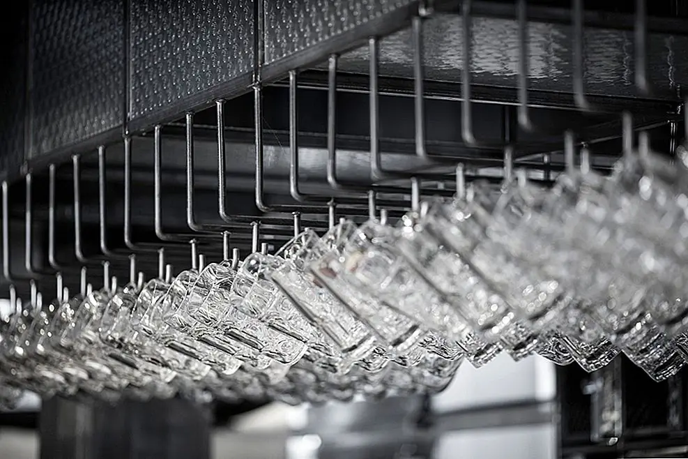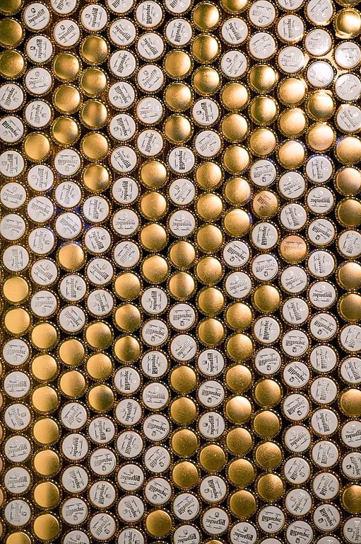 «Мы разработали входную стенку туалета с композицией из 7500 белых и золотых пивных шапок, собранных в узор, который отражает свет и светит сквозь пространство», - сказали архитекторы. «Das Bier - это прежде всего место для любителей пива». [Фотография любезно предоставлена дизайном Humà + архитектура]
