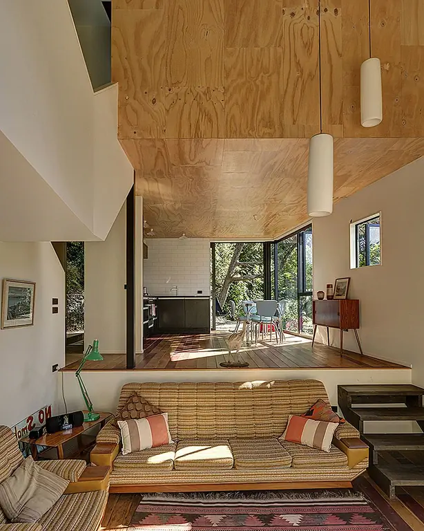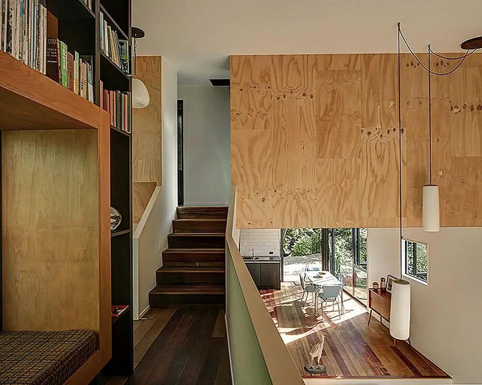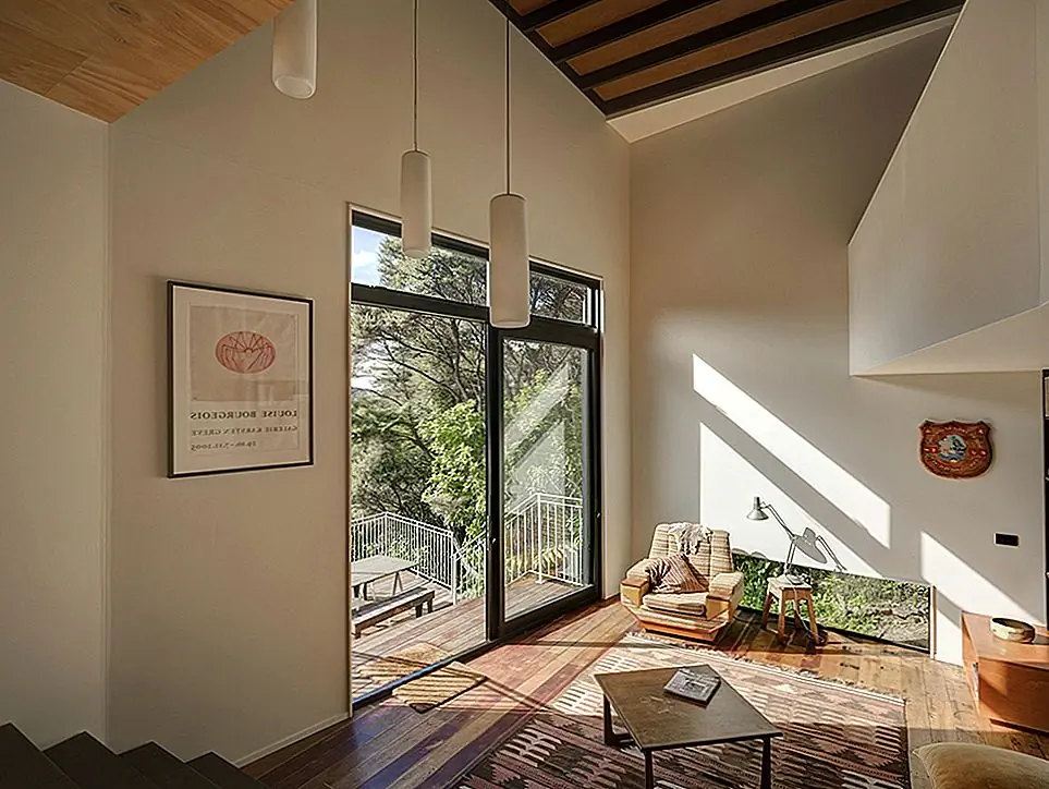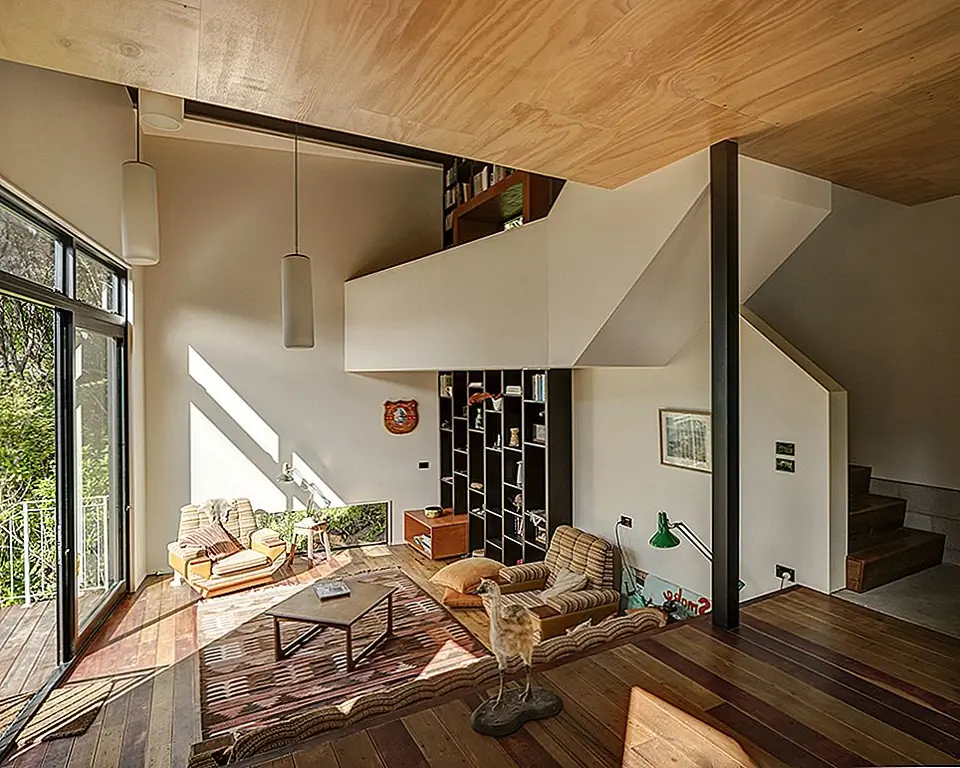 Башня вмещает спальню пары и завершена с очень скромным бюджетом. По словам архитекторов,дом состоит из четырех внутренних разделенных уровней и двух колод, которые позволяют варьировать связи с ландшафтом, с кухней и столовой на одном уровне и жить ниже. На втором этаже есть спальня и ванная комната с мезонинной библиотекой на лестничной площадке«. Дизайн интерьера сочетает в себе современный минимализм с традиционными декорами, что приводит к практичным, но очень теплым жилым помещениям.