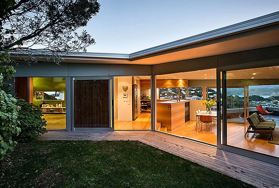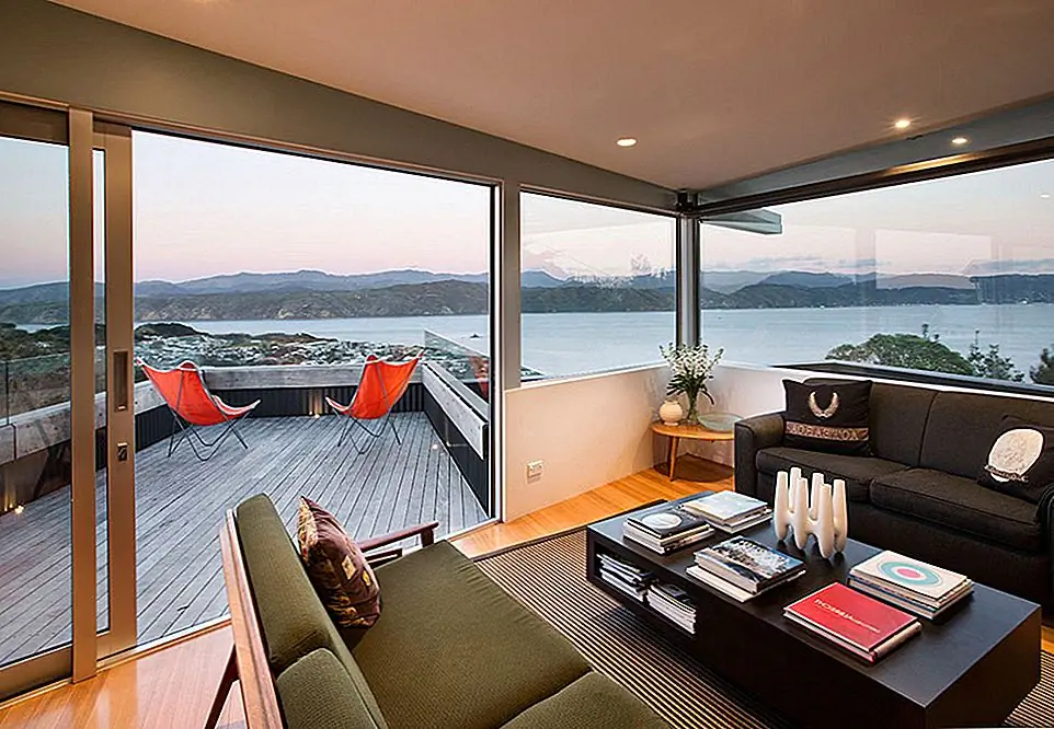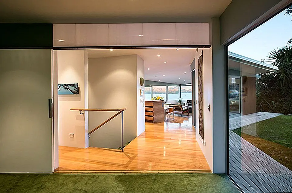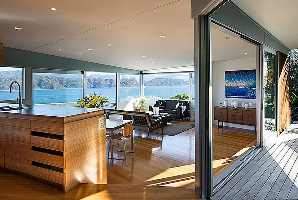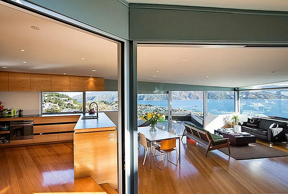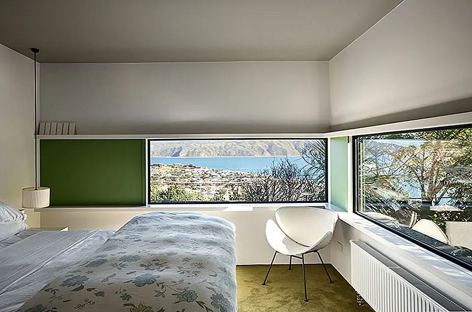 По словам архитекторов, два отдельных тома могут быть четко разделены: «Уровень спальни выкапывается обратно на склоне холма, образуя основу для верхнего, открытого и светлого уровня жизни. Уровень спальни волнистый в и из, позволяя свет и взгляды, давая каждой спальне другой характер и аспект. Более легкая форма уровня жизни над потоком протекает по уровню спальни, обертывая вокруг существующего небольшого плоского газона и сада к северо-западу от дома. Уровень пола спускается вниз по направлению к газону и позволяет просматривать виды через дом и выходить в гавань за пределами ». Интерьеры дружелюбны и приветливы, благодаря обширному использованию дерева, обилие цветных окон от пола до потолка с видом на гавань.