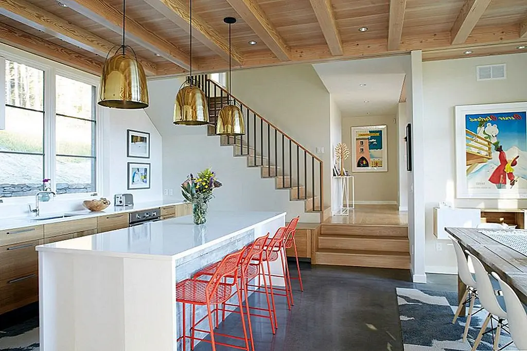 По словам архитекторов, материалы из натурального материала, такие как древесная рама, сайдинг из цементного волокна, листовой металл и бетон на основе картона, были переосмыслены, чтобы иметь современный фокус. «Высокие окна стратегически расположены вокруг внутренних пространств, чтобы обеспечить оптимальный вид на горные хребты на расстоянии и обеспечить естественный свет для ключевых жилых помещений».