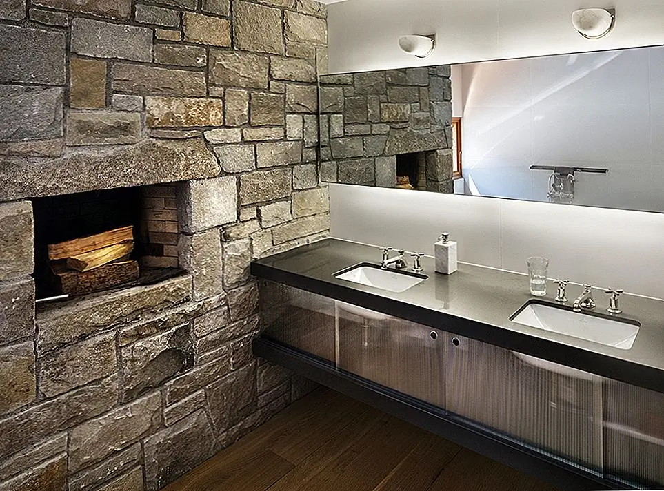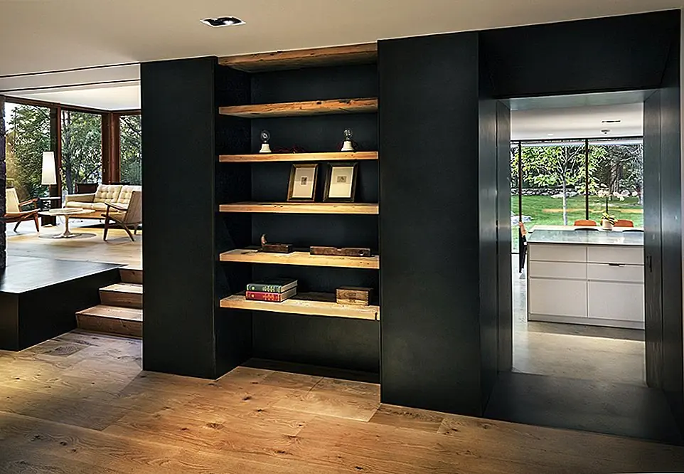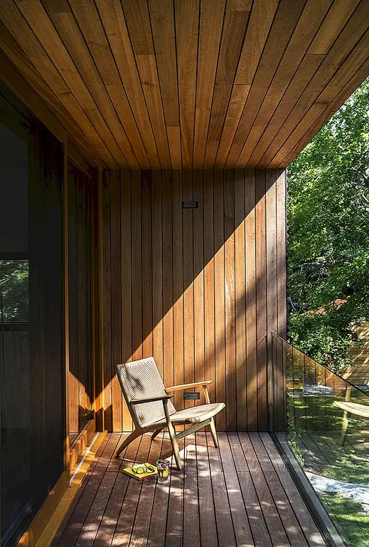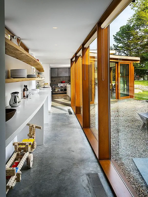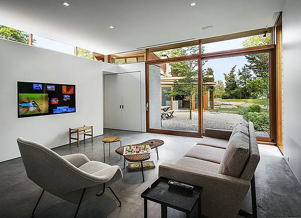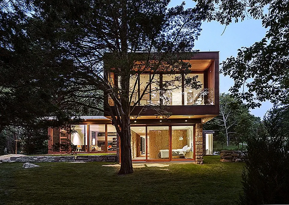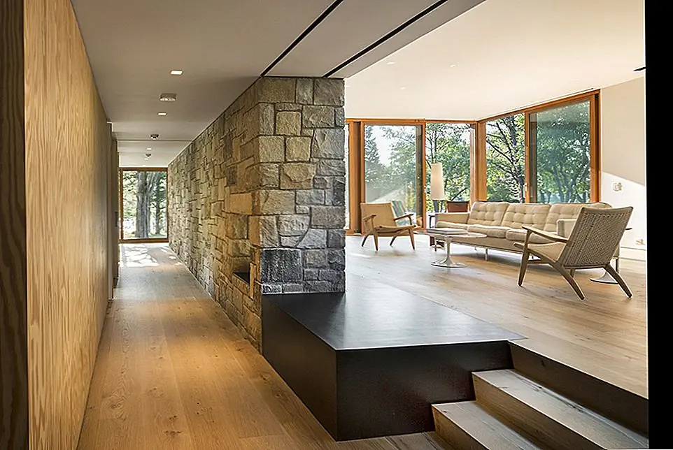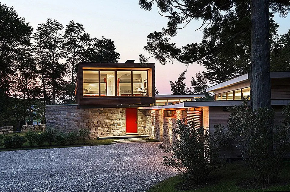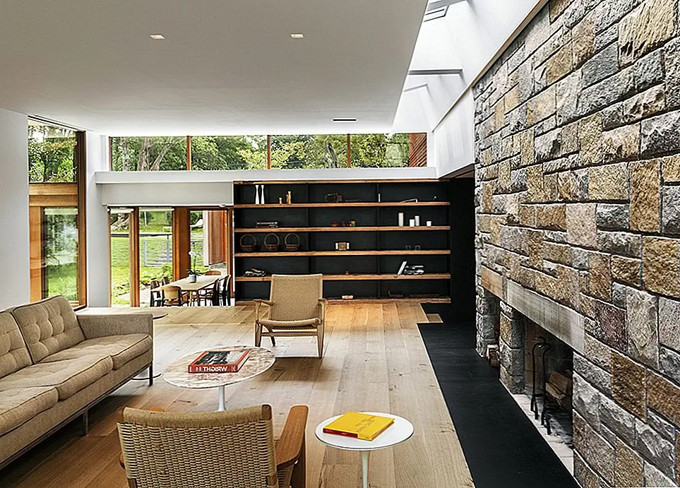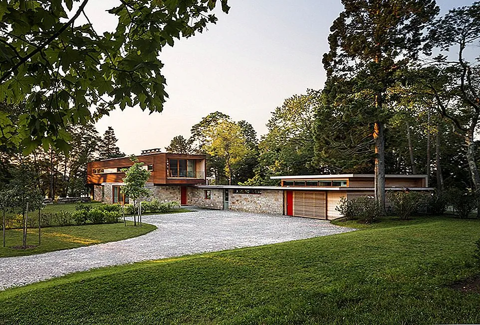 Резиденция Стонингтон это отреставрированный исторический дом, окружающий большой луг в штате Коннектикут, США. Первоначально разработанный архитектором Джоном Линкольном в 1945 году, проект инкапсулирует некоторые интересные функции:Влияние Фрэнка Ллойда Райта проявляется в использовании Линкольном камня, угловых окон и плоской крыши. Из-за природы материалов и методов строительства, используемых в оригинальном здании, процесс проектирования был сродни археологическому исследованию, раскрытию уникальных деталей дома и включению его материалов и методов в новый дизайн«. Открытые площади - гараж, бассейн, студия и патио - были организованы с помощью естественных скальных выходов.