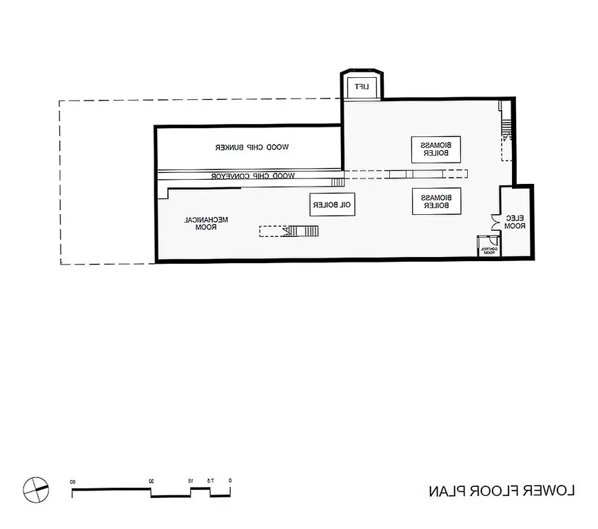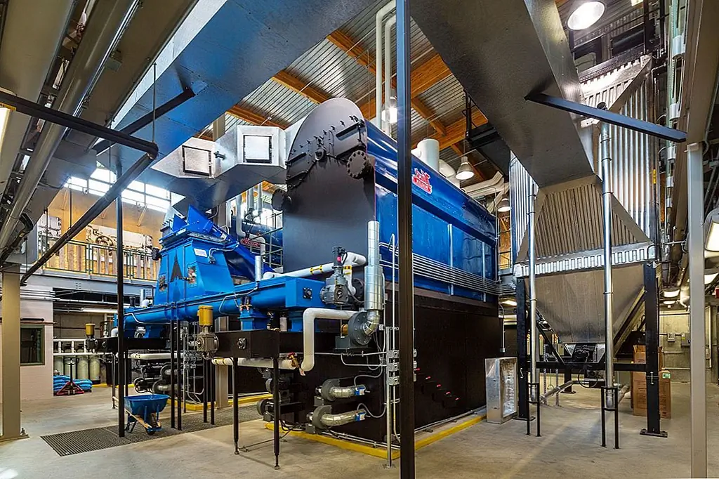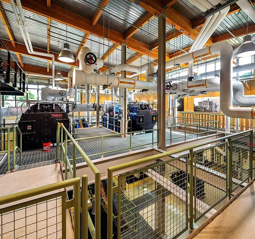 Завод сжигает устойчиво собранную древесную щепу, чтобы нагреть 85 зданий, которые составляют 1,2 миллиона квадратных футов:Международная углеродно-нейтральная нефть, обозначенная Международной группой по изменению климата, является экологически чистым топливом, являющимся побочным продуктом устойчиво управляемых лесов; они заменяют около 150 000 галлонов импортированного мазута в год, сокращая выбросы в целом, наиболее резко двуокись серы более чем на 90 процентов«. Отходы золы собираются для использования в качестве удобрения для соседних огородов.