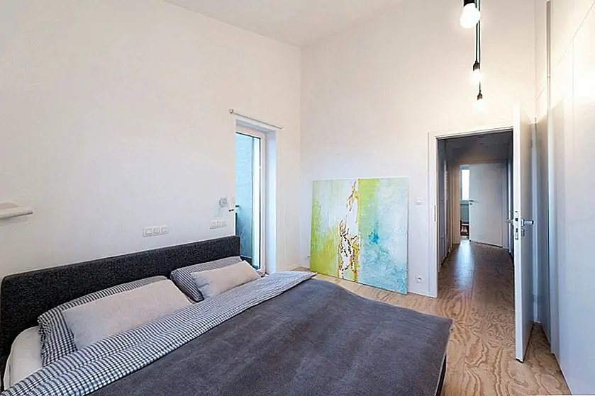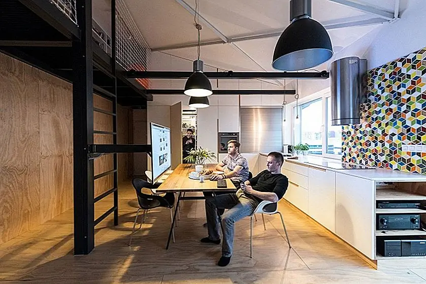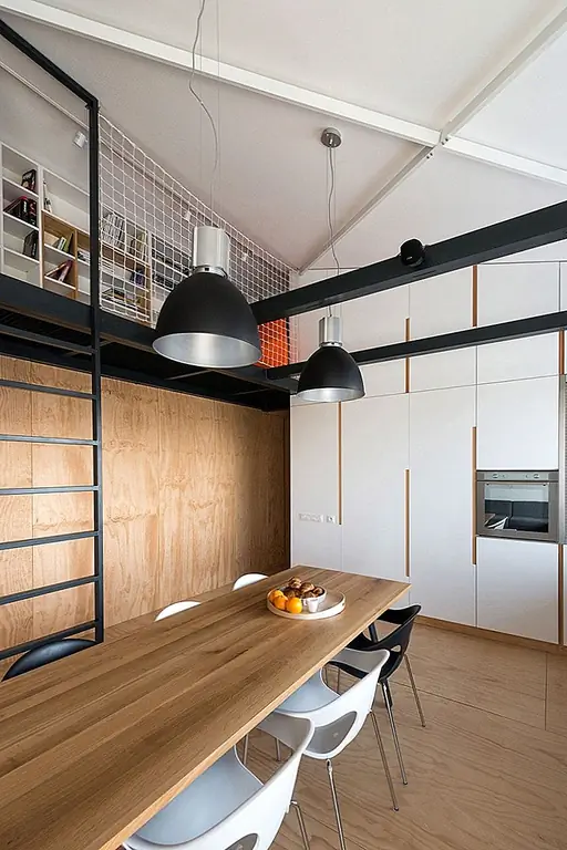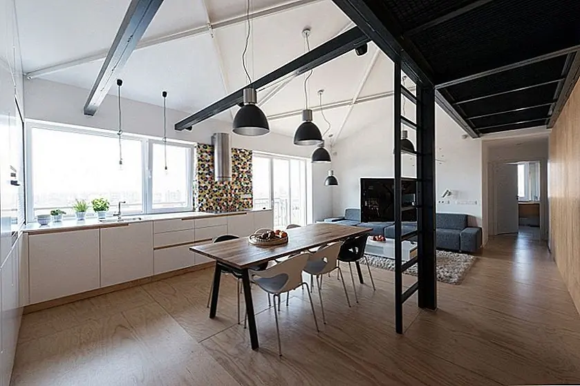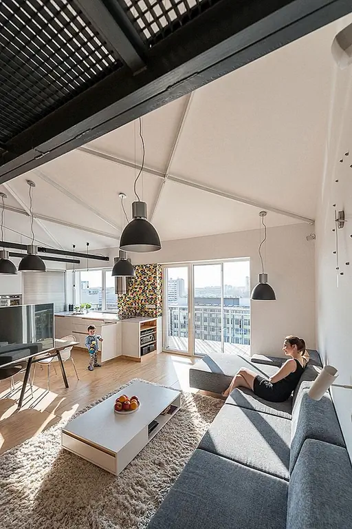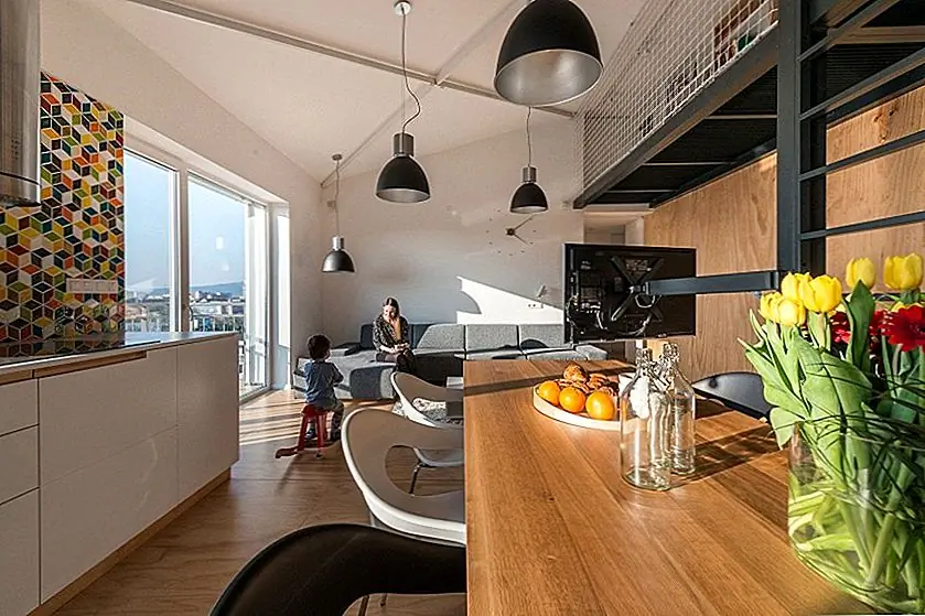 Комплексный и универсальный Лофт Квартира в надстройке это проект, недавно реализованный ПРАВИЛА архитекторов в Братиславе, Словакия. Современная квартира может похвастаться хорошим сочетанием цветов и текстур, которые обеспечивают тепло в промышленной обстановке: «Проверенная комбинация дерева с черно-белыми работами в любое время и в любом месте. Элементы, которые находятся в непосредственном контакте с посетителем, пол и стена напротив окна, были спроектированы из соснового дерева. Стены, потолок и подогнанная мебель - белые. В нейтральном пространстве черная конструкция крыши замечательна ».