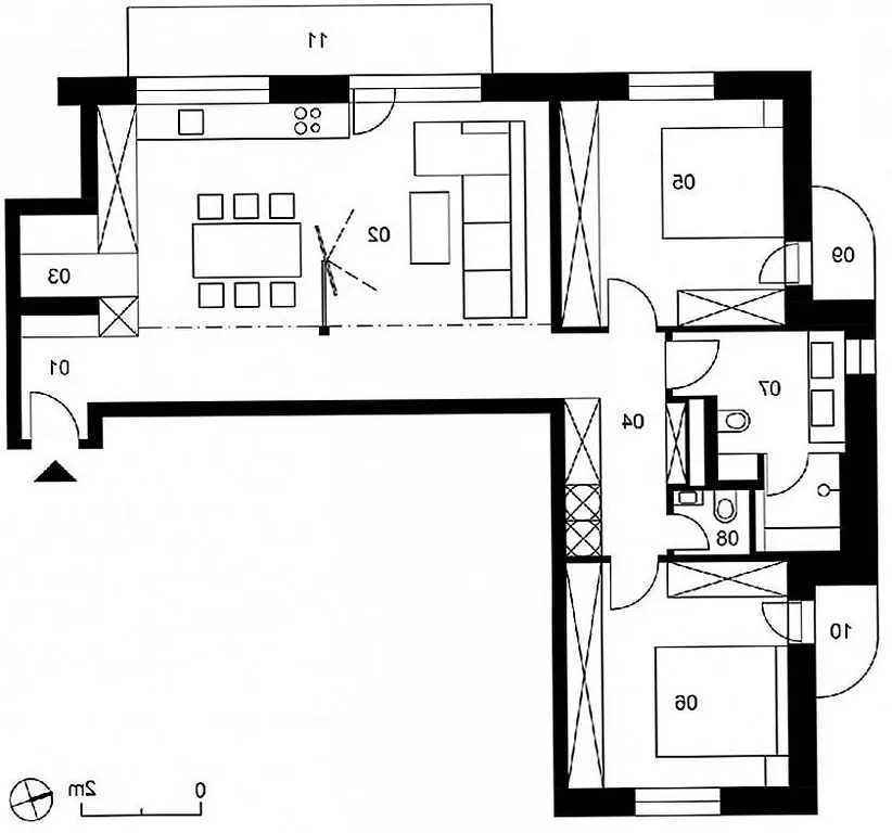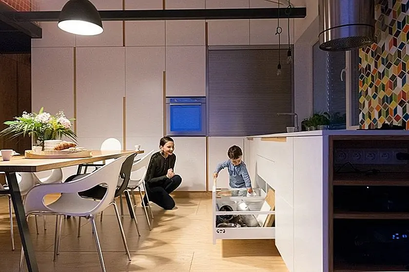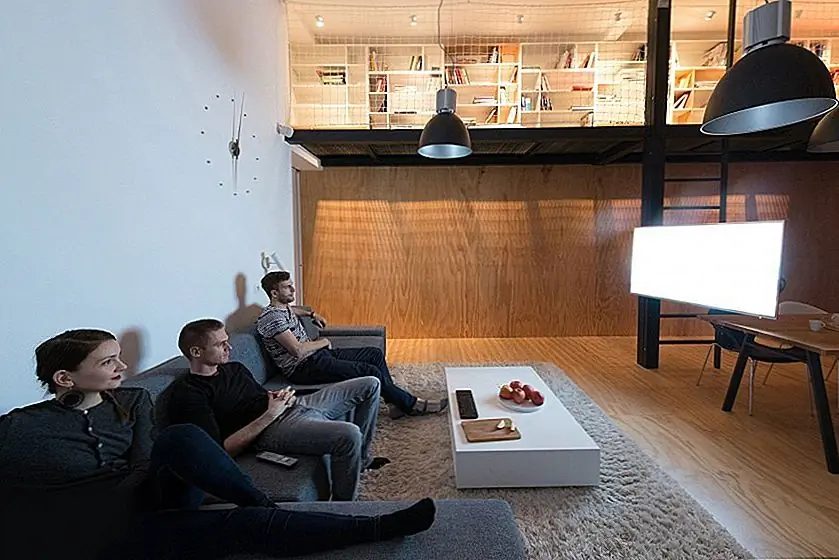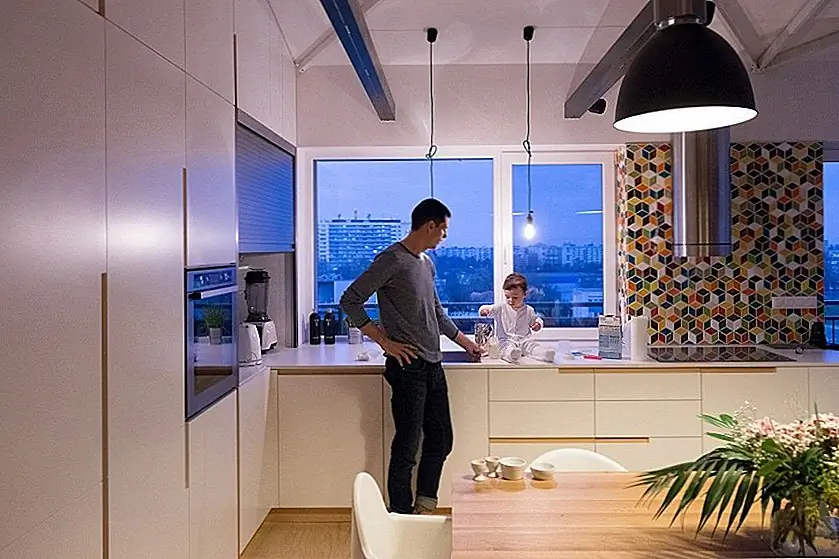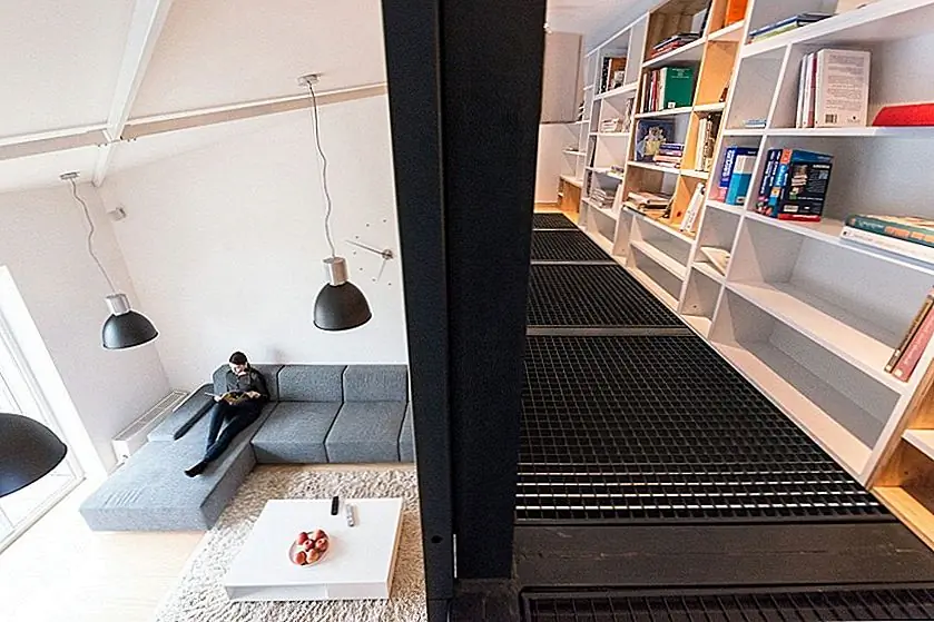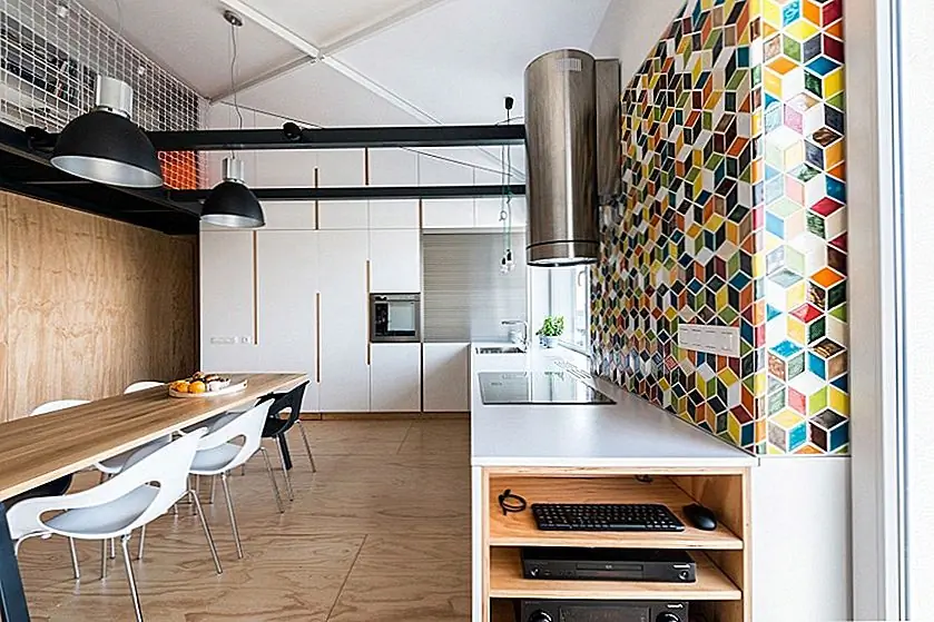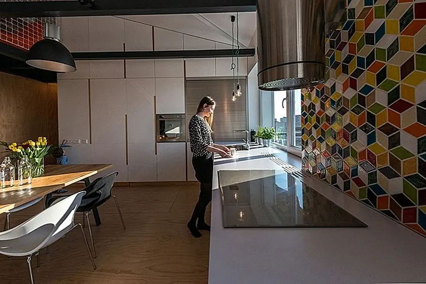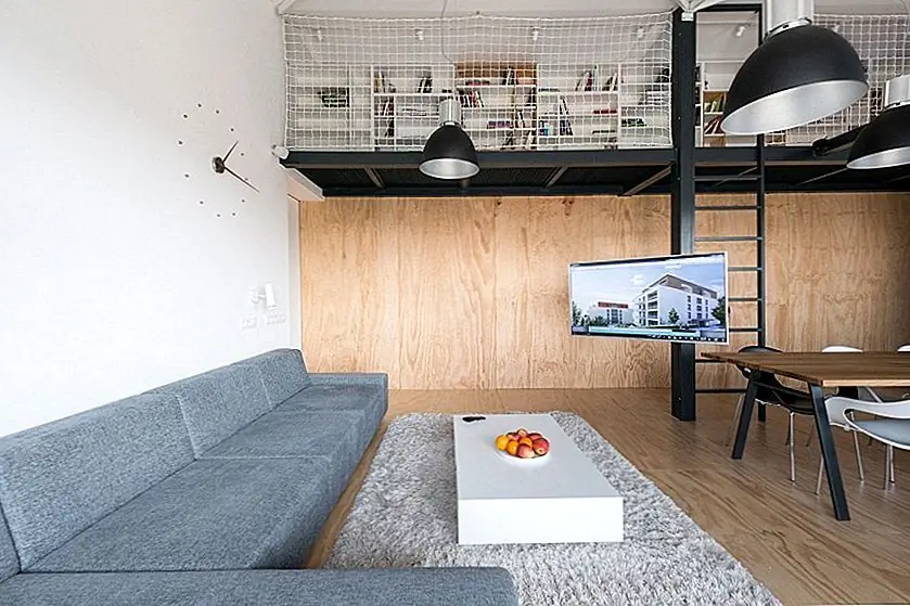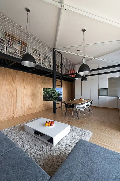 Макет дома был продиктован одной особенностью: «Поскольку высота квартиры на самой высокой точке составляет почти четыре метра, ее можно разделить на два уровня. На нижнем уровне есть гостиная, столовая и кухня, на верхнем - мезонин с книжным шкафом. Опускаемая часть расположена над коммуникационной частью дневной зоны, поэтому нижняя ясная высота не мешает пространству », - объяснили дизайнеры. В мезонине для игрового эффекта использовалась сеть вместо перила. Другие элементы дизайна, которые выделяются, включают в себя книжный шкаф с сумочкой для чтения, телевизор на вращающемся кронштейне и мозаику из мозаики ручной работы на кухне. [Фотографии Питера Кинталана]
