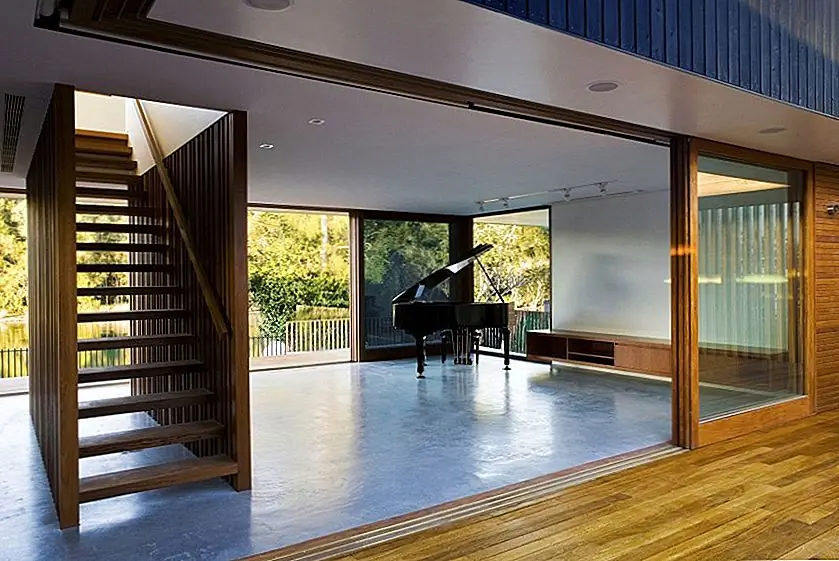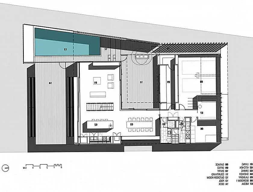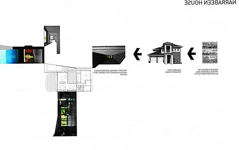 Наррабинская резиденция играет с этим драматическим контрастом между спиной и перед домом в поисках «загородной мечты». Это приводит к динамичному плану дома:Центральный двор представлен как главный организационный элемент для планирования со всеми ключевыми разделяемыми пространствами дома - гостиной, столовой, кухней, кабинетом и бассейном - сгруппирован вокруг двора, чтобы визуально соединить эти пространства и физически, когда стены во дворе открываются. Просторная и гибкая, австралийская резиденция предлагает здоровый, яркий семейный дом.