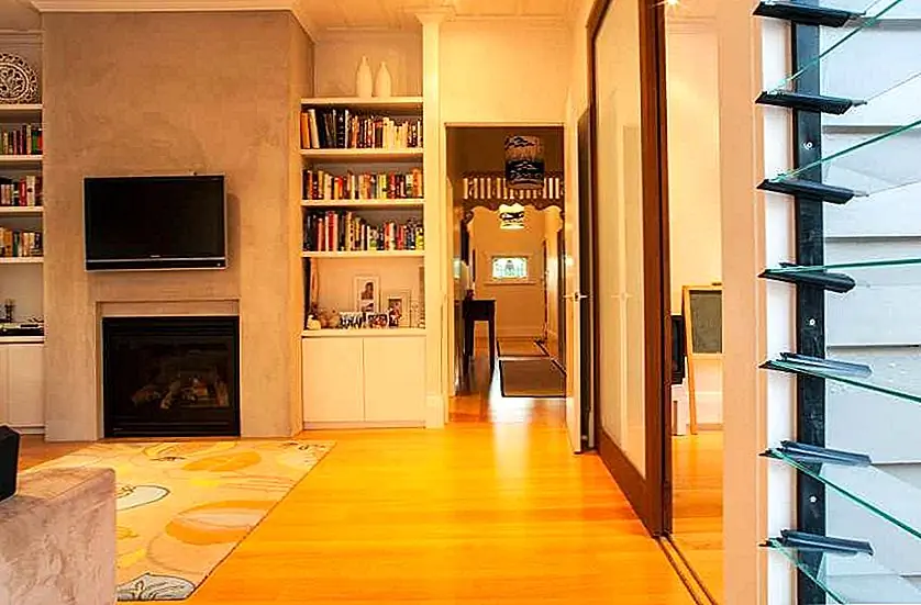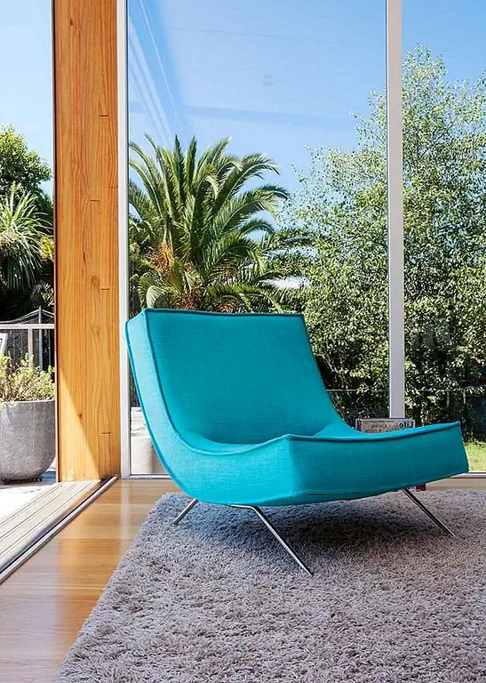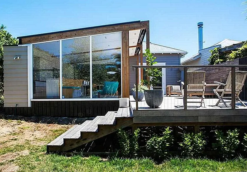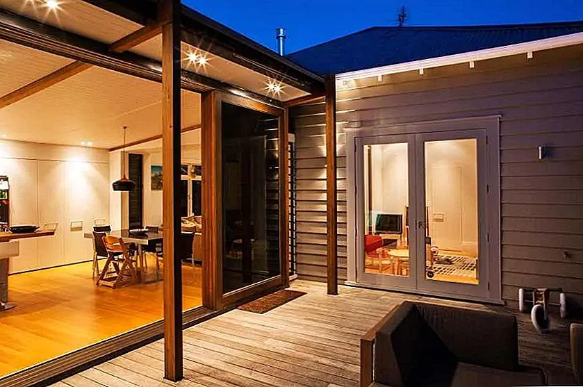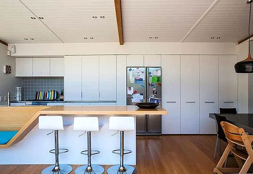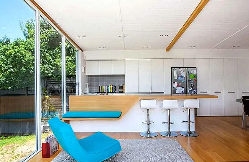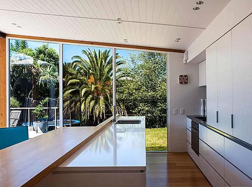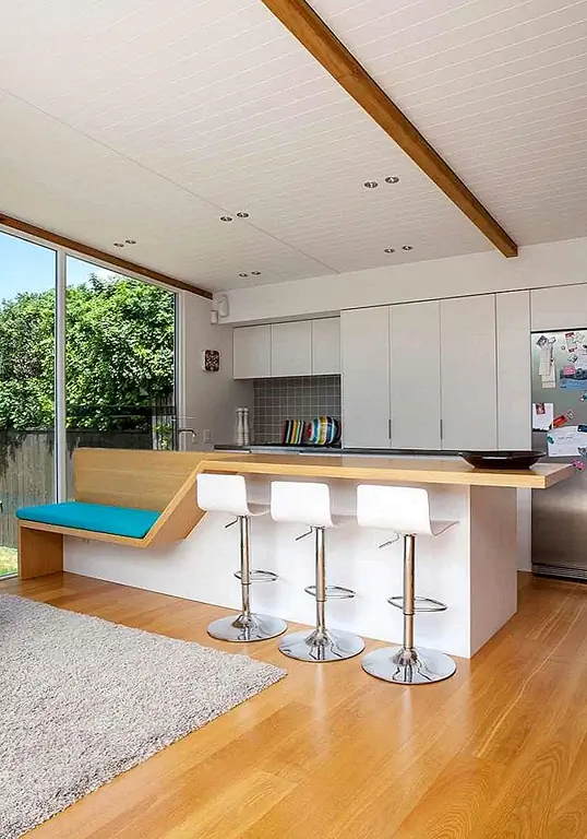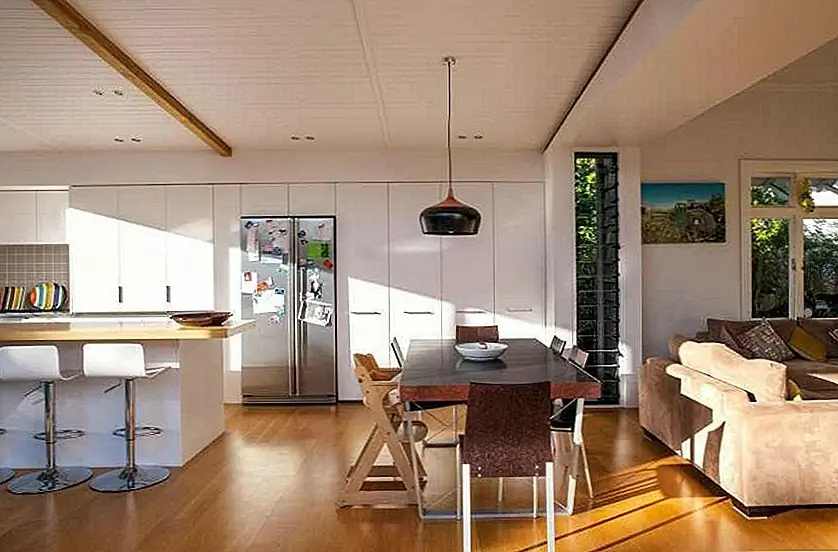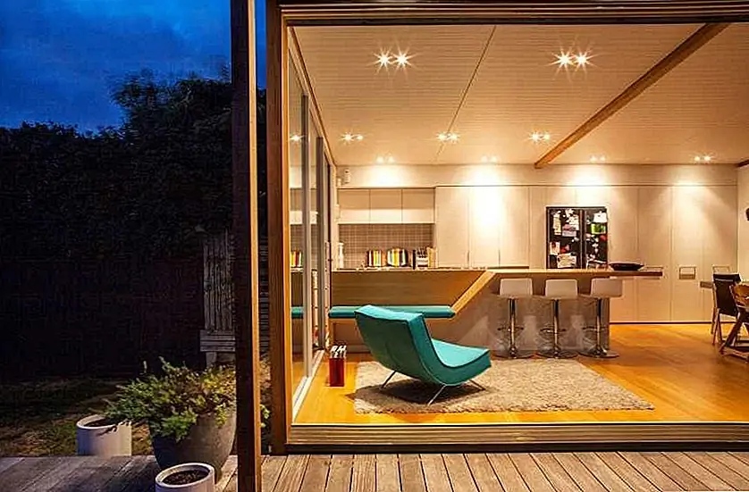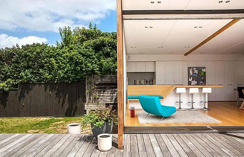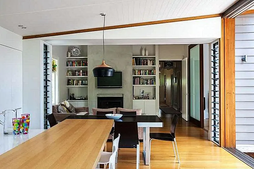 Природные материалы использовались по характеру соседства: «Открытые порталы из древесины глулама создали здесь ритм архитектуры; они выходят за пределы застекленных ползунков, чтобы пересечь границу между павильоном и палубой. Одноэтажная крыша придает объем, а стена из белого лакированного краснодеревщика повышает это чувство легкости. Существенность бунгало Киви отражается в потолках с рифленым слоем и наложенном дубовым полом, который беспрепятственно проходит по всему дому. Существующий камин был модернизирован, чтобы сформировать фокус в пространстве открытой планировки. «Что вы думаете об этом нетрадиционном стеклянном и деревянном ящике?