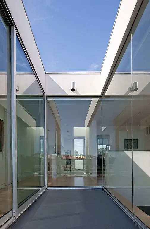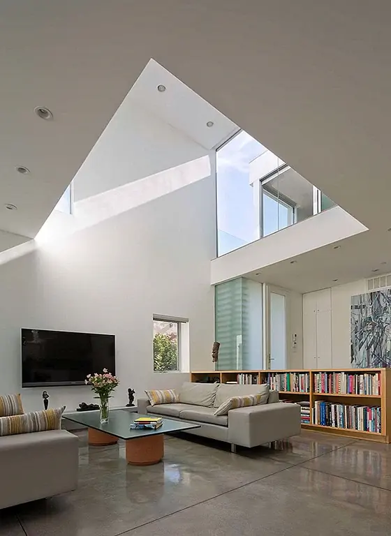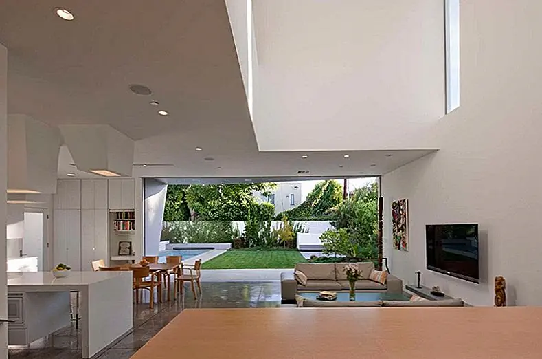 Предназначенный для семьи из четырех человек, современный семейный дом имеет «вырезанную» террасу на втором этаже, которая помогает разделить пространства на переднюю и заднюю части. «На первом этаже главный вход в структуру отделяет гараж и гостевую комнату от кухни, столовой и гостиной, выходящих на задний двор. На втором этаже терраса и атриум обеспечивают уединение между спальней родителей и спальней их детей и игровыми площадками, из которых открывается вид на игровые площадки в задней части.”