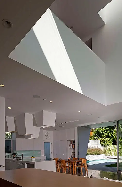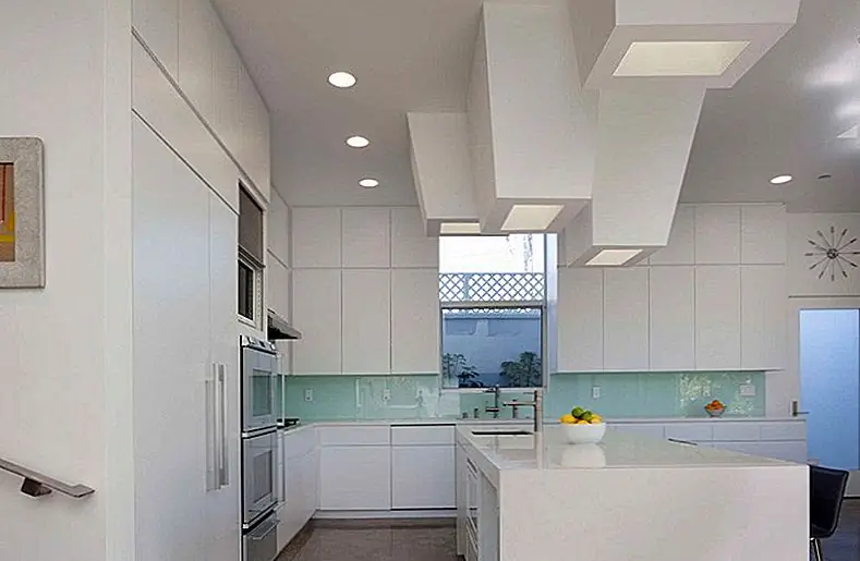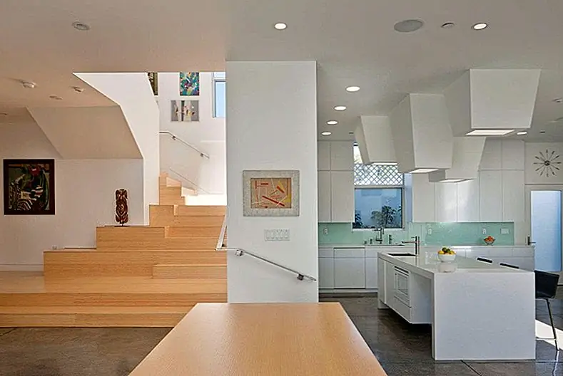 Самое поразительное в этом современном семейном доме - это кухонный дизайн. В нем основное внимание уделяется необходимости естественного освещения и пространственных пространств. Воображаемый Джоном Фридманом Алиса Кимм Архитекторы, дом, укрывающий эту вдохновляющую кухню, известен как резиденция Холлеба. Расположенный в районе Ocean Park в Санта-Монике в Калифорнии, дом площадью 4000 кв. Футов был умышленно представлен как скульптурная лестница, разделяющая полы и множество деталей, чтобы удивить кого-то, кто видит ее в первый раз.