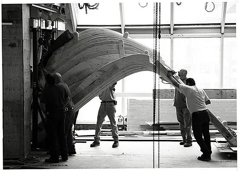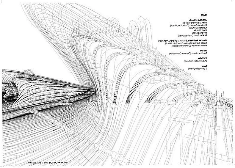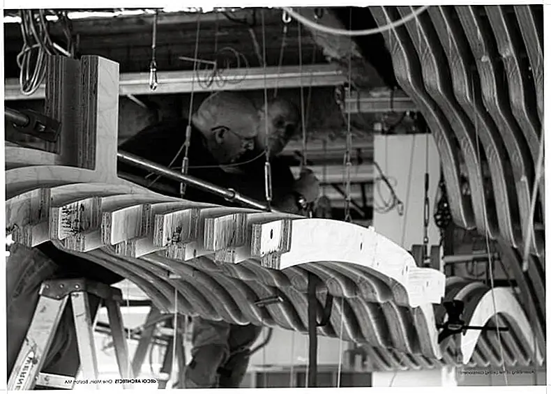 Для этого проекта архитекторы предоставили файлы обработки, в которых были указаны точные формы, которые они предусмотрели для этого пространства. Изготовители использовали 3-осевой маршрутизатор с цифровым управлением (ЧПУ) для точной фрезерования листов фанеры. Фактически, процесс практически не делал ошибок в более чем миллион линейных футов резки фанеры.