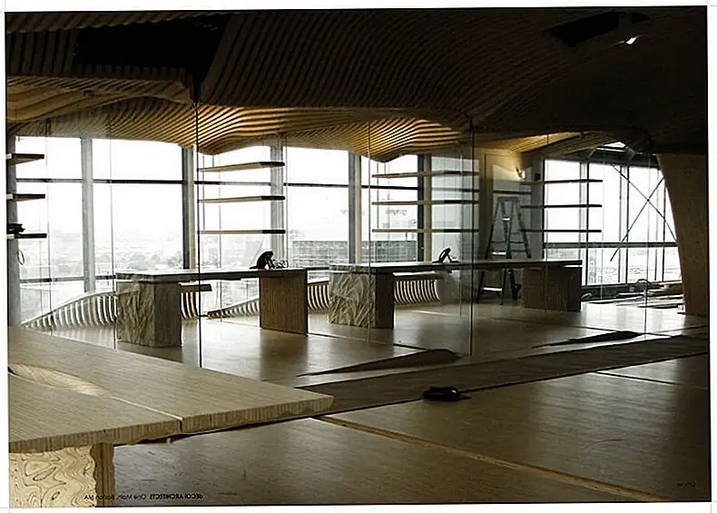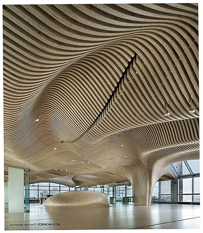 Художественные волны в этом скульптурном Один главный офис реновация была спроектирована архитекторами dECOi, каждая из которых полностью адаптирована к элегантности и функциональности. Каждые две плоскости, пол и потолок, по-видимому, проходят через комнату. Согласно dECOi, он «выражает как цифровой генезис, так и логику бесшовной логики».