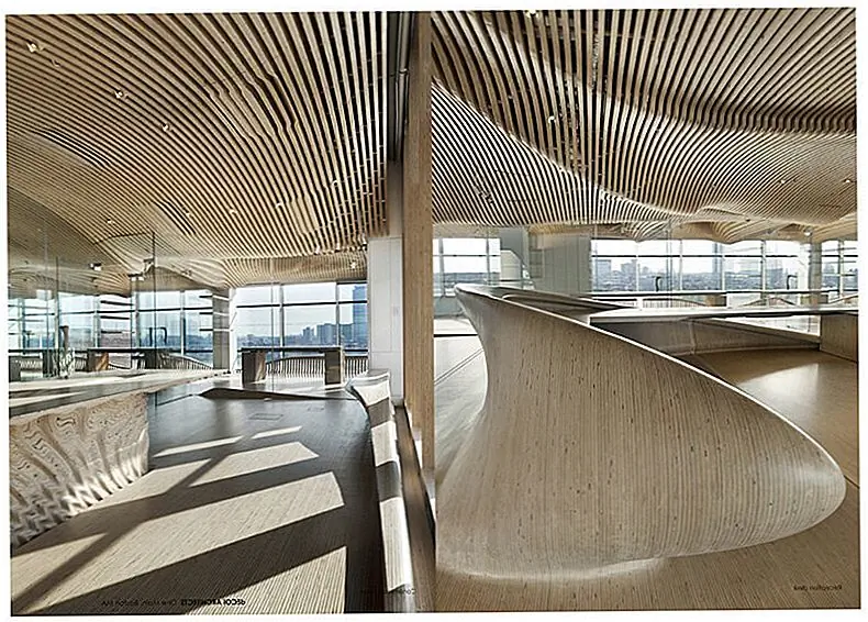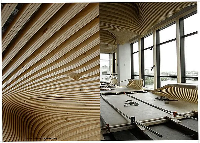 dECOi решила заменить традиционные промышленные элементы, такие как дверные ручки и вентиляционные отверстия, с непрерывными фанерными формами, которые сгибаются, чтобы соответствовать функциям. Однако это лишь один пример нюансов в рамках проекта. Например, они также предоставили индивидуальные математические поверхности для каждого офиса. Некоторые из таблиц были построены с использованием параметров «напряжение» и «ирония» вместе с настроением клиента во время изготовления. [Фотография и информация предоставлены архитектором dECOi]