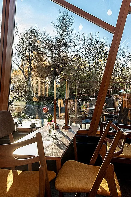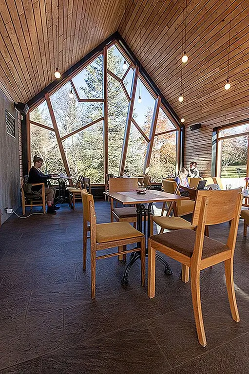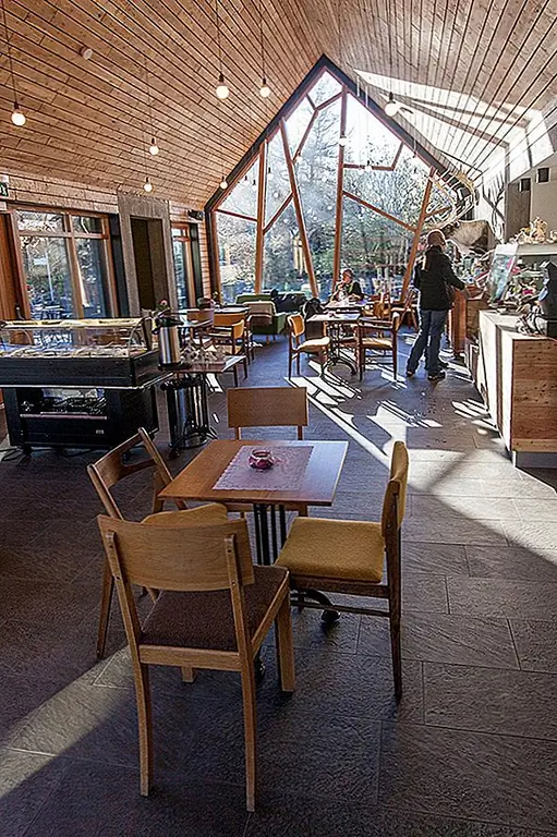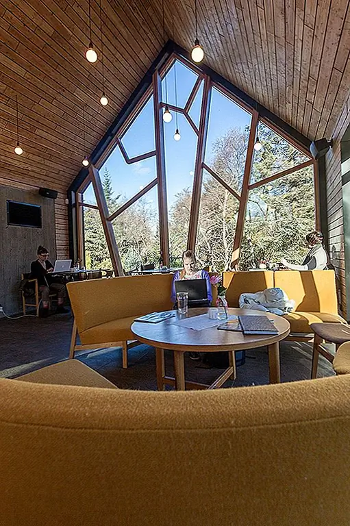Внутри, деревянно-деревенский дизайн ждет изучения. У вас есть разные типы таблиц (округлые, прямоугольные - в зависимости от того, что вы намереваетесь делать). Вы можете принести свой ноутбук, позволить себе вдохновляться сайтом и эффективно работать. Архитекторы не хотели украсть великолепие природы, поэтому кофейня стала аксессуаром для сада, а не как революционное высокотехнологичное здание. Панорамные окна от пола до потолка позволяют свету скользить внутрь. Мирное и вдохновляющее, это, безусловно, идеальное место, если вы хотите насладиться природой и кофе.