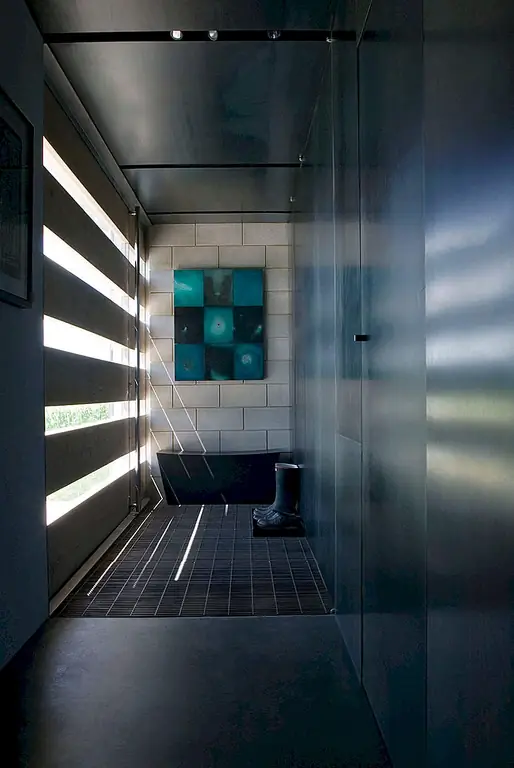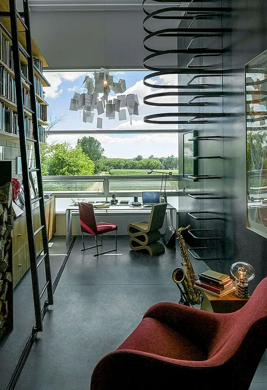 Офис на одной стороне дома имеет сочетание уникальных предметов, в том числе люстра для канцелярских принадлежностей. Однако, прежде всего, силосная лестница поднимается на одну из стен офиса в скрытую обсерваторию для наблюдения за звездами. [Фотография Билла Тиммермана и любезность журнала dezeen]