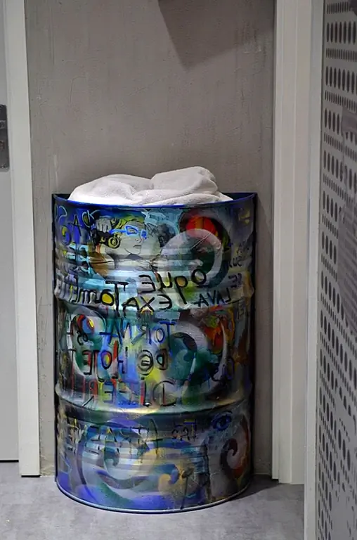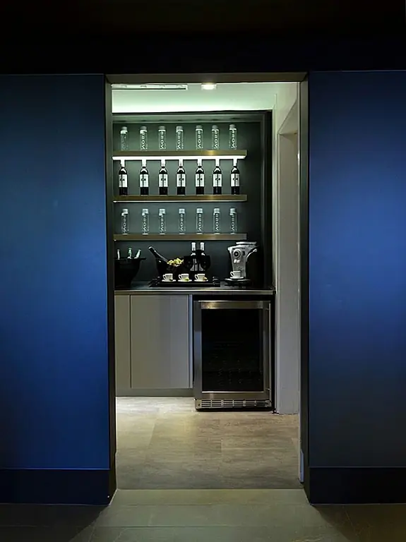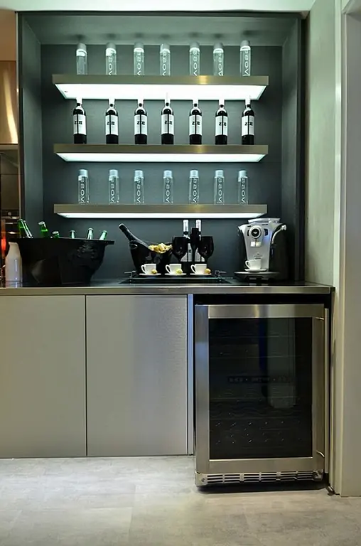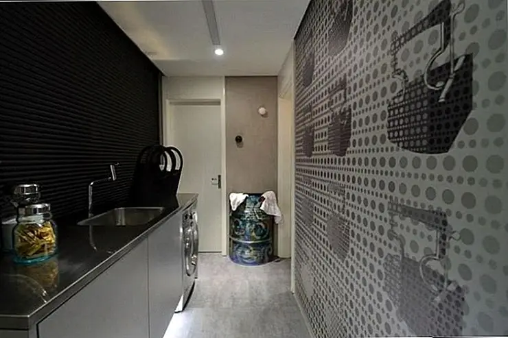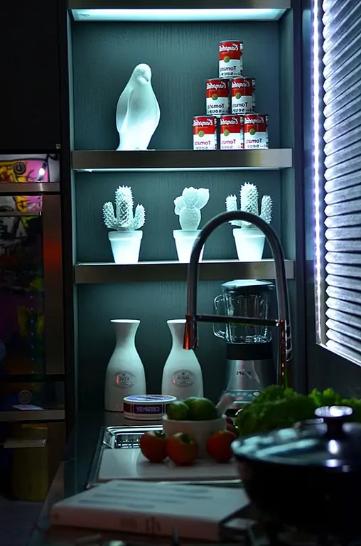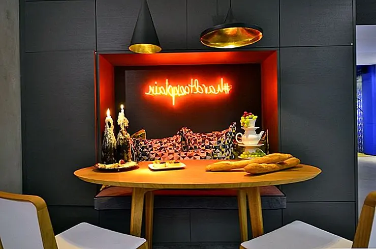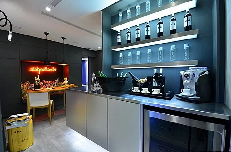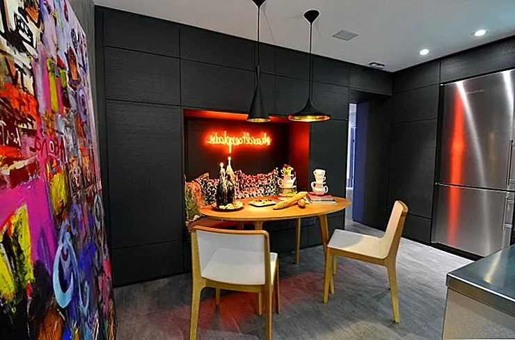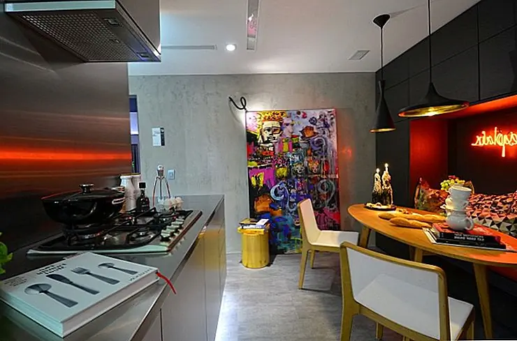 Кухня имеет два входа, один выбитый через бар, а другой - туннель, встроенный непосредственно в мебель. Все кухонное оборудование тщательно организовано, и забавные элементы случайно отображаются на всей территории кухни. «Гостиная зона была подсвечена благодаря использованию светодиодного освещения и неонового искусства. В качестве дополнения к приходу можно найти яркое современное полотно художника Лу Боргетти ».