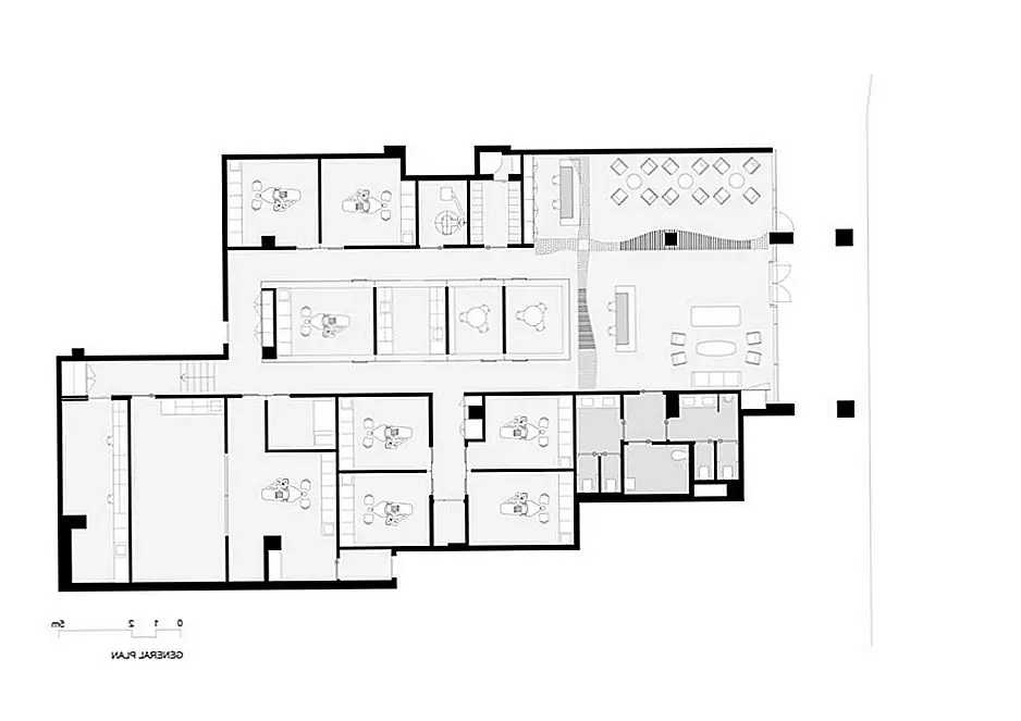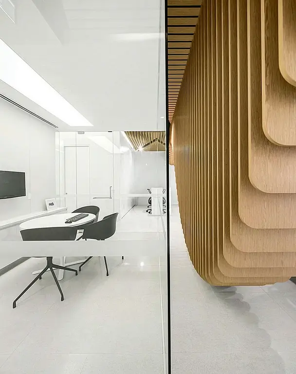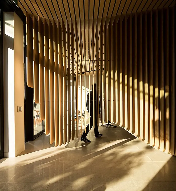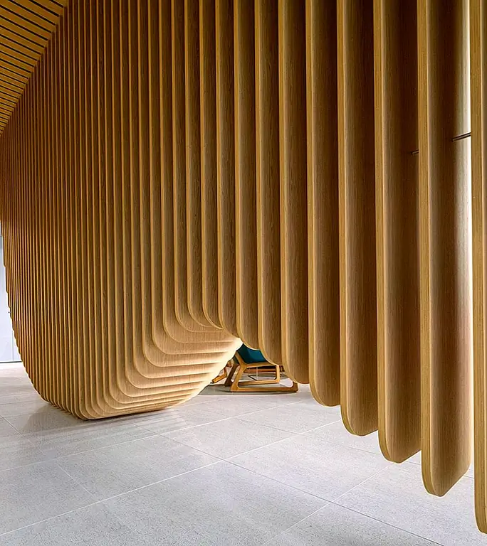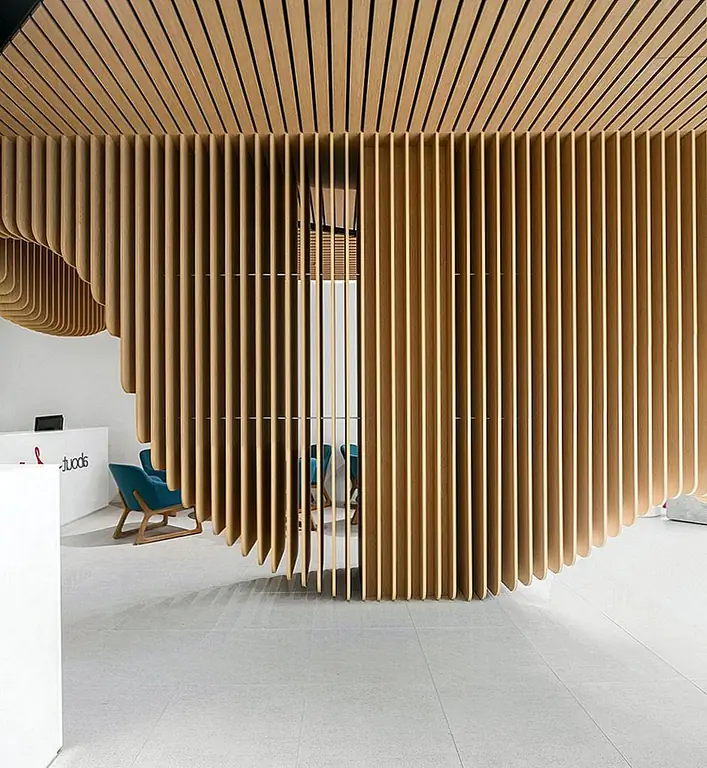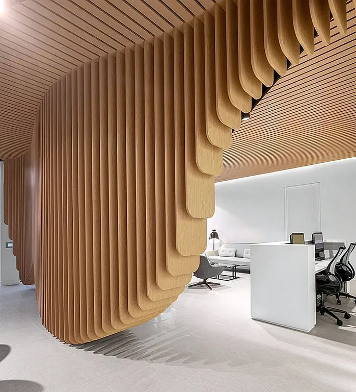 Для этого архитекторы создали скульптурный деревянный элемент, который служит фильтром между двумя зонами приема. Этот элемент выполняет двойную функцию: допускает частичное видение между пространствами, разделяя их и в то же время делая бетонную колонну равной нулю! Построенный из подвесных деревянных досок, которые начинаются с узких элементов, которые затем расширяются, чтобы охватить существующую колонну, этот элемент был ответом на помещение и стал преобладающей функцией, работающей в качестве генератора пространства, влияющей на потолок и другие элементы.