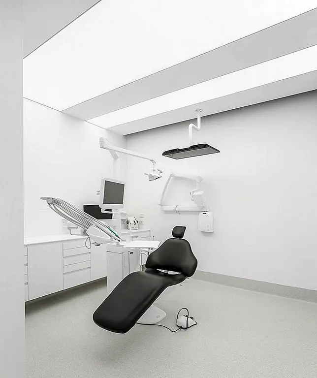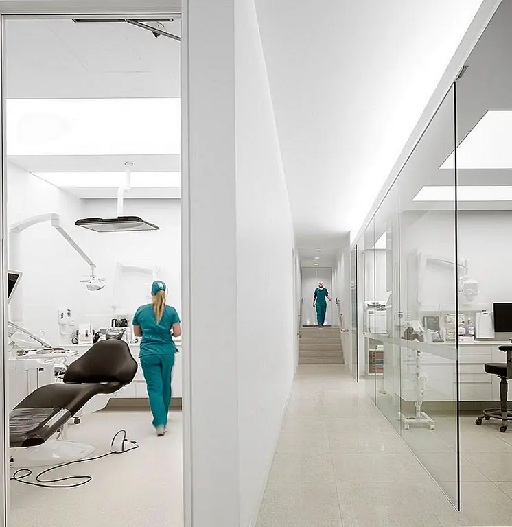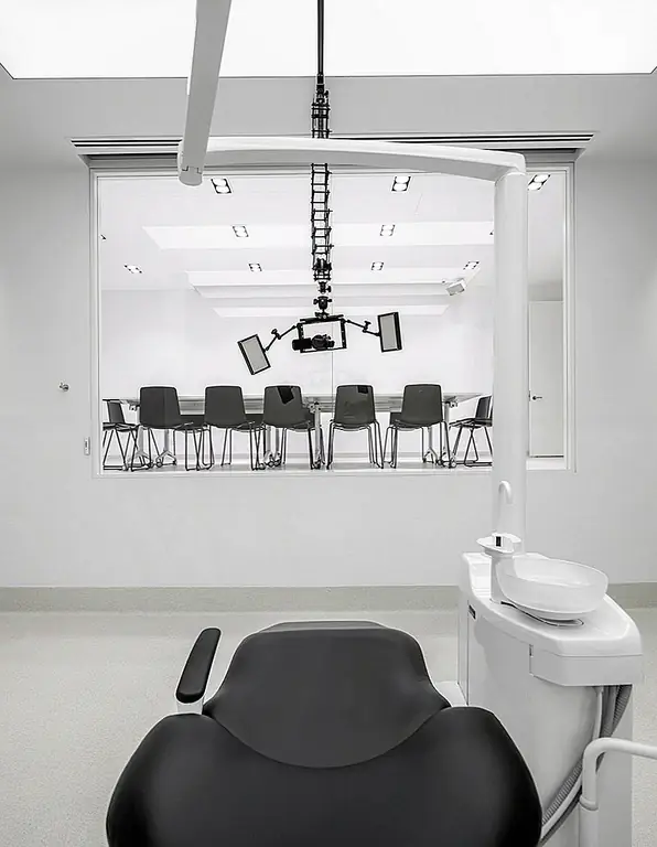 Оставшееся пространство клиники расположено вокруг центрального коридора, который начинается в приемной, которая соединяет все сложные части стоматологической клиники, от зон обследования, операций, клиентских зон и технических помещений. В середине этого коридора вы найдете прозрачное центральное ядро из стекла, позволяющее естественному свету внутри. Архитекторы заключают: «Таким образом, это пространство, где выполняются сложные процедуры, и мы попытались создать соответствующее пространство, которое сообщает об этом уровне сложности, оставляя положительное и запоминающееся впечатление на пациентов, которые его использовали». [Фотографии и информация, предоставленные Архитекторы Педра Сильва; Фото: Фернандо Гуэрра]