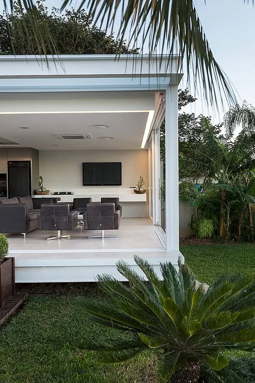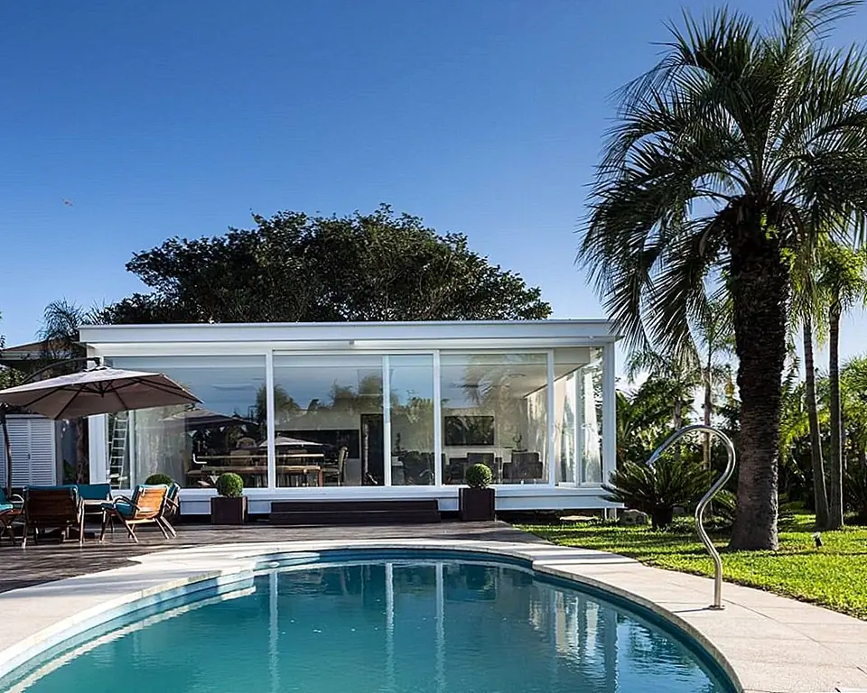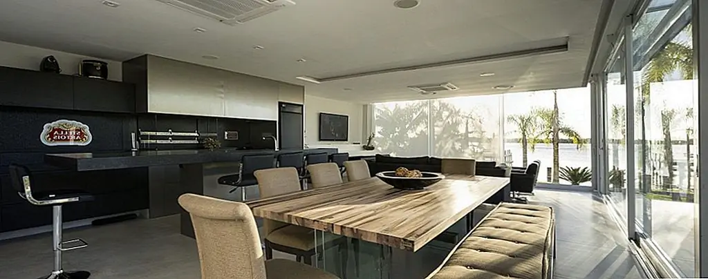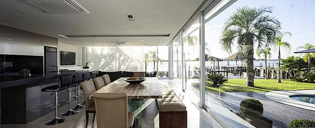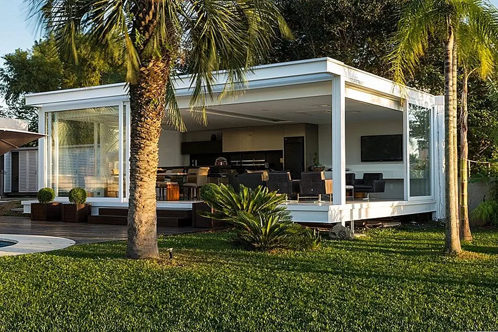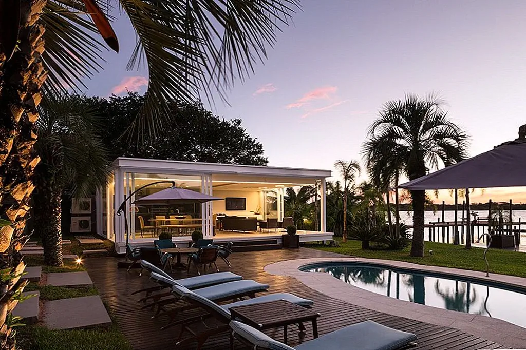 С временной шкалой строительства всего 30 дней этот современный Дом в бассейне в Бразилии впечатляет своими стройными линиями и приветственными площадками для отдыха на свежем воздухе. При планировании резиденции архитекторы Кали Аркиеттура решил, что «край призмы будет помещен на сухопутную границу, а три другие стены будут большими мобильными стеклянными стенами (раздвижные двери, которые обеспечивают плотную интеграцию с окружающей средой)». Поскольку это была конструкция, которая должна была быть разработана в короткий период времени, была выбрана металлическая структура. Это также делает дом легким, положительным фактором с учетом близости реки.