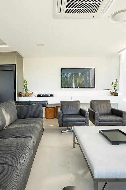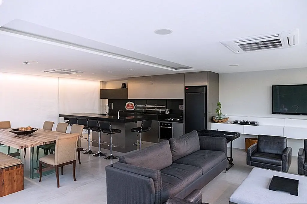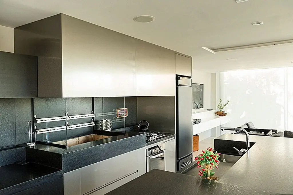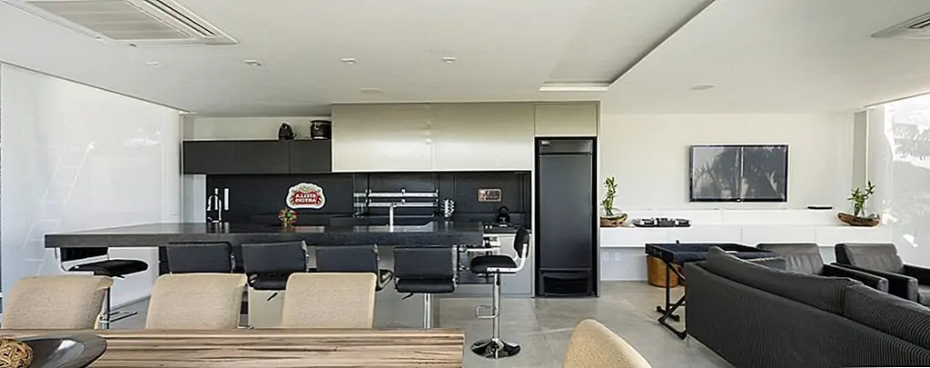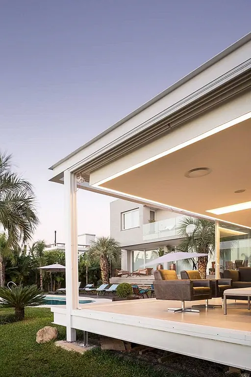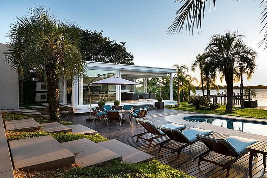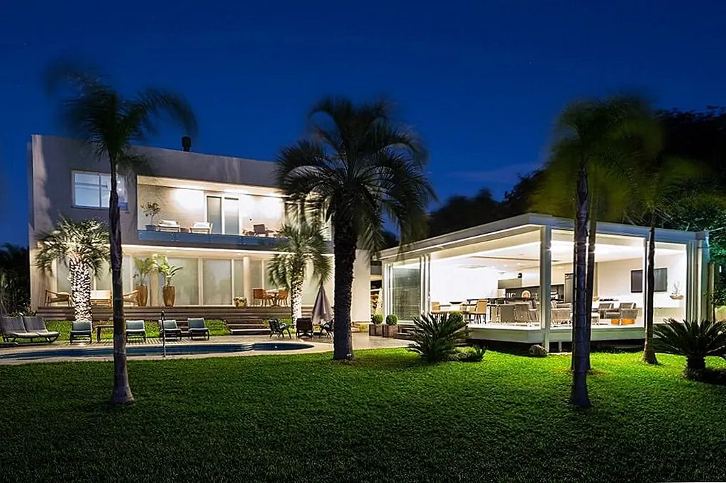 С временной шкалой строительства всего 30 дней этот современный Дом в бассейне в Бразилии впечатляет своими стройными линиями и приветственными площадками для отдыха на свежем воздухе. При планировании резиденции архитекторы Кали Аркиеттура решил, что «край призмы будет помещен на сухопутную границу, а три другие стены будут большими мобильными стеклянными стенами (раздвижные двери, которые обеспечивают плотную интеграцию с окружающей средой)». Поскольку это была конструкция, которая должна была быть разработана в короткий период времени, была выбрана металлическая структура. Это также делает дом легким, положительным фактором с учетом близости реки.