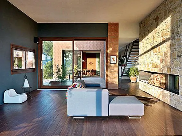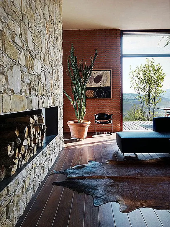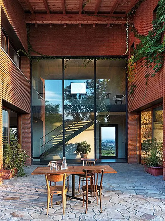 Организованная вокруг центрального двора, современная резиденция имеет ряд тщательно спроектированных пространств:Первый этаж состоит из гардероба и складского помещения и двух больших комнат, которые визуально соединены через большие раздвижные застекленные двери: кухня и столовая, которые задуманы как одно пространство и гостиная; эти районы были спроектированы как серия пространств, которые ведут от одного к другому и снаружи, через внутренний двор и к террасе с деревянной террасой. На первом этаже есть четыре спальни и две ванные комнаты. Полы покрыты досками из дерева ироко, а местный камень укладывается нерегулярно. Кирпич внешних возвышений продолжает внутри, чтобы стать одним из внутренних отделочных материалов, а также штукатуркой и большой каменной стеной с камином и нишей для дров из листового металла в жилой зоне«Предназначенный для того, чтобы чувствовать себя и выглядеть комфортно и вдохновляюще, этот дом сельской мечты охвачен естественной восходящей зеленой стеной, которая завершает прочную связь с природой.
