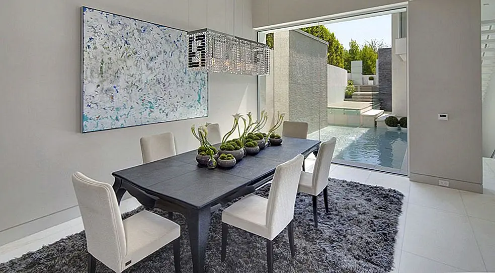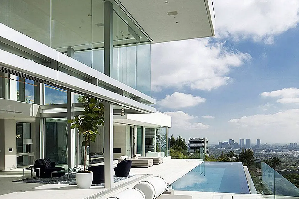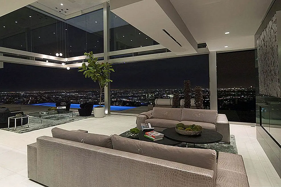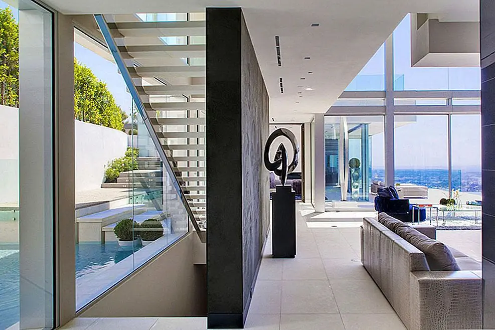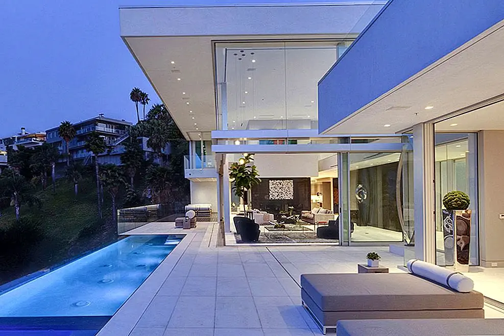 Материалы и формы переплетаются, чтобы составить удивительную современную резиденцию: «Двухэтажная гостиная - редкость по соседству и в сочетании со светом, приходящим со всех сторон, придает дому просторную атмосферу. Палитра для дома - гладкий Голливуд; черный и белый, блестящие и замшевые, делающие много использования мрамора, темного гранита и хрома, а также шкафов с высоким глянцем и специальной обои. «С уникальным бесконечным краем бассейна, простирающимся вдоль главной палубы, этот роскошный дом искрится с благодарностью за его места, материалов и художественной интерпретации современной жизни.