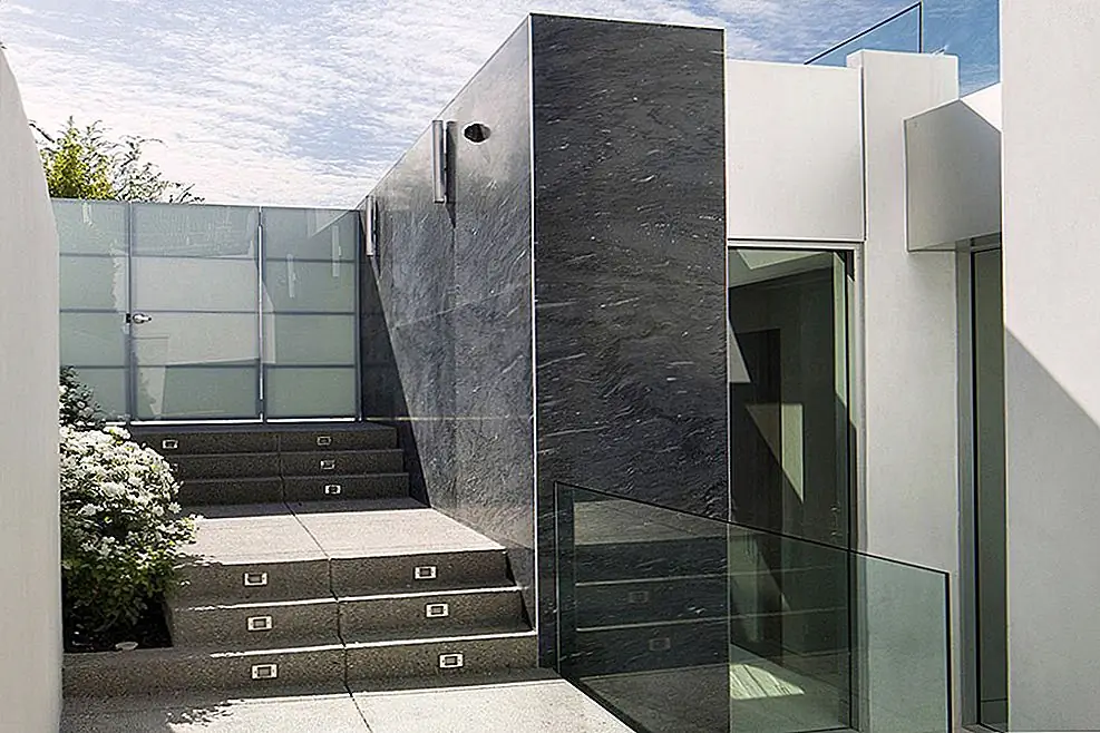 Архитекторы объясняют проблемы, которые им пришлось преодолеть, чтобы воплотить мечты владельца: «Задача состояла в том, чтобы перенести дом на склоне холма и создать подходящий вход и достаточное жизненное пространство с учетом крутой топографии. Наше решение заключалось в том, чтобы отделить гараж и паркинг от входа в дом. Это воспользовалось уличным уклоном, чтобы пешеходы могли войти на главный уровень дома, давая нам возможность создать водный и светлый входной двор ».